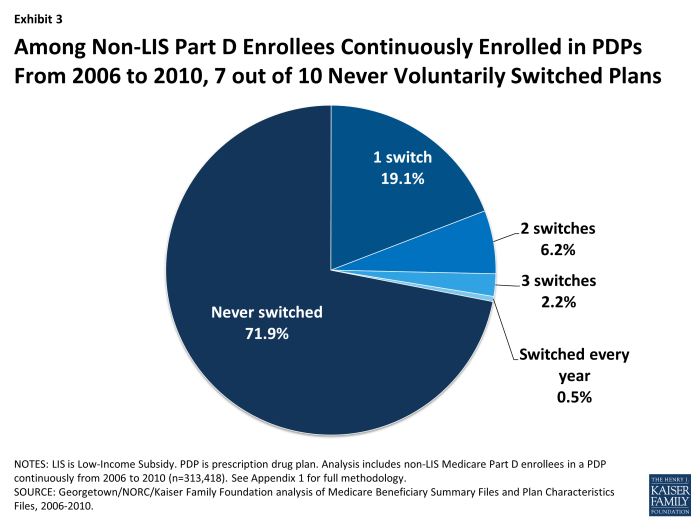 Of the five-year Part D enrollees who did switch PDPs at least once during the four enrollment periods, about two of every three made only a single switch. A small subset of PDP enrollees (about 3 percent) made frequent use of the opportunity to select a new PDP by switching plans in at least three of the first four annual enrollment periods, if not every year.