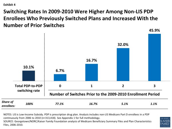 - Relatively large premium increases for a PDP from one year to the next were associated with higher rates of plan switching between 2006 and 2010; but most enrollees with relatively large premium increases (such as $10 or more per month) did not switch plans in any of the four annual enrollment periods.