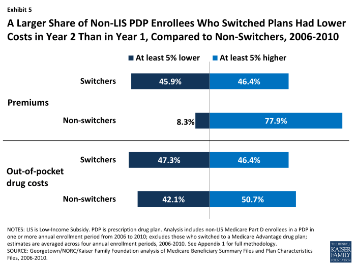Based on a combined measure of total out-of-pocket spending, including premiums and cost sharing for drugs, 44 percent of switchers had overall costs that were at least 5 percent lower, whereas only 28 percent of non-switchers experienced the same level of cost reduction.
