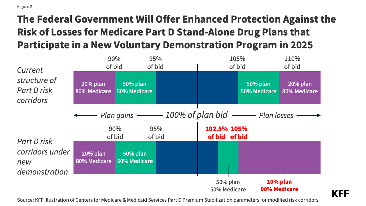 Although Part D plans will be taking on additional liability for high drug costs in 2025, Medicare will continue to limit their liability for higher-than-expected drug costs through risk corridors, a risk sharing mechanism that has been in place since the Part D program started in 2006. In addition, CMS is launching a new voluntary demonstration to provide enhanced risk-corridor protection against overall losses for participating stand-alone PDPs to help stabilize the market (see details below).