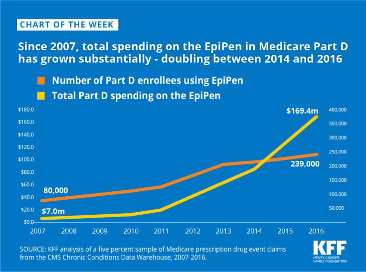 Since 2007, total spending on the EpiPen in Medicare Part D has grown substantially – doubling between 2014 and 2016