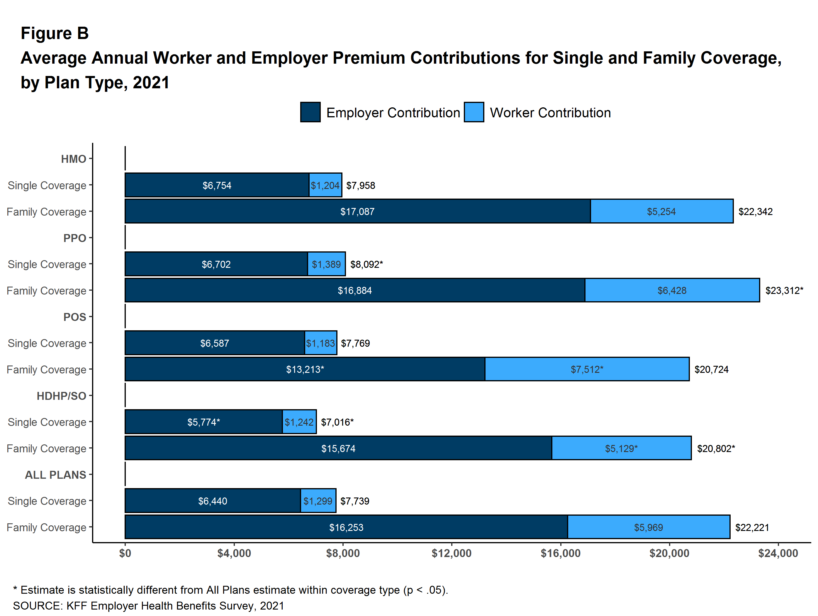 Figure B: Average Annual Worker and Employer Premium Contributions for Single and Family Coverage, by Plan Type, 2021