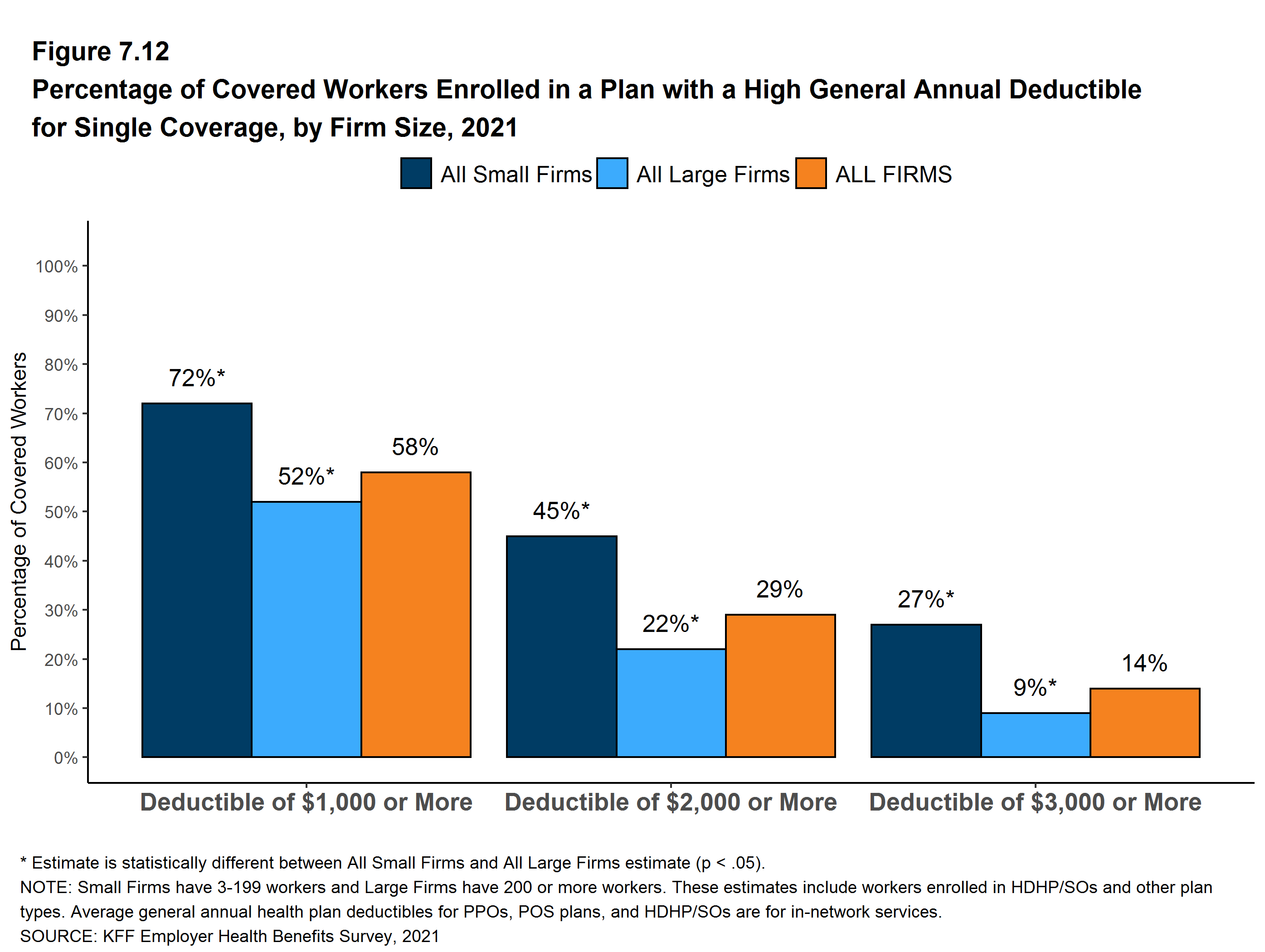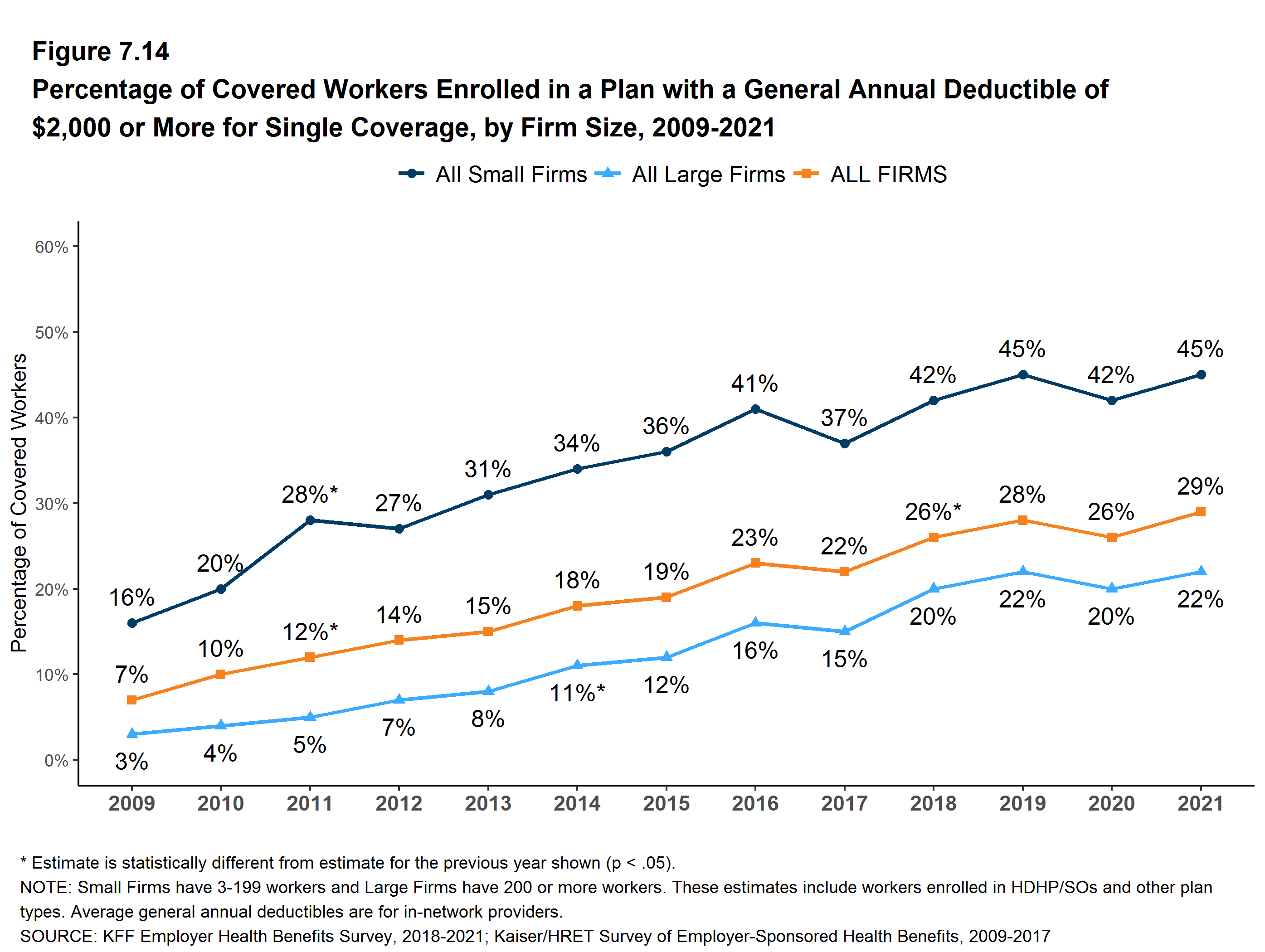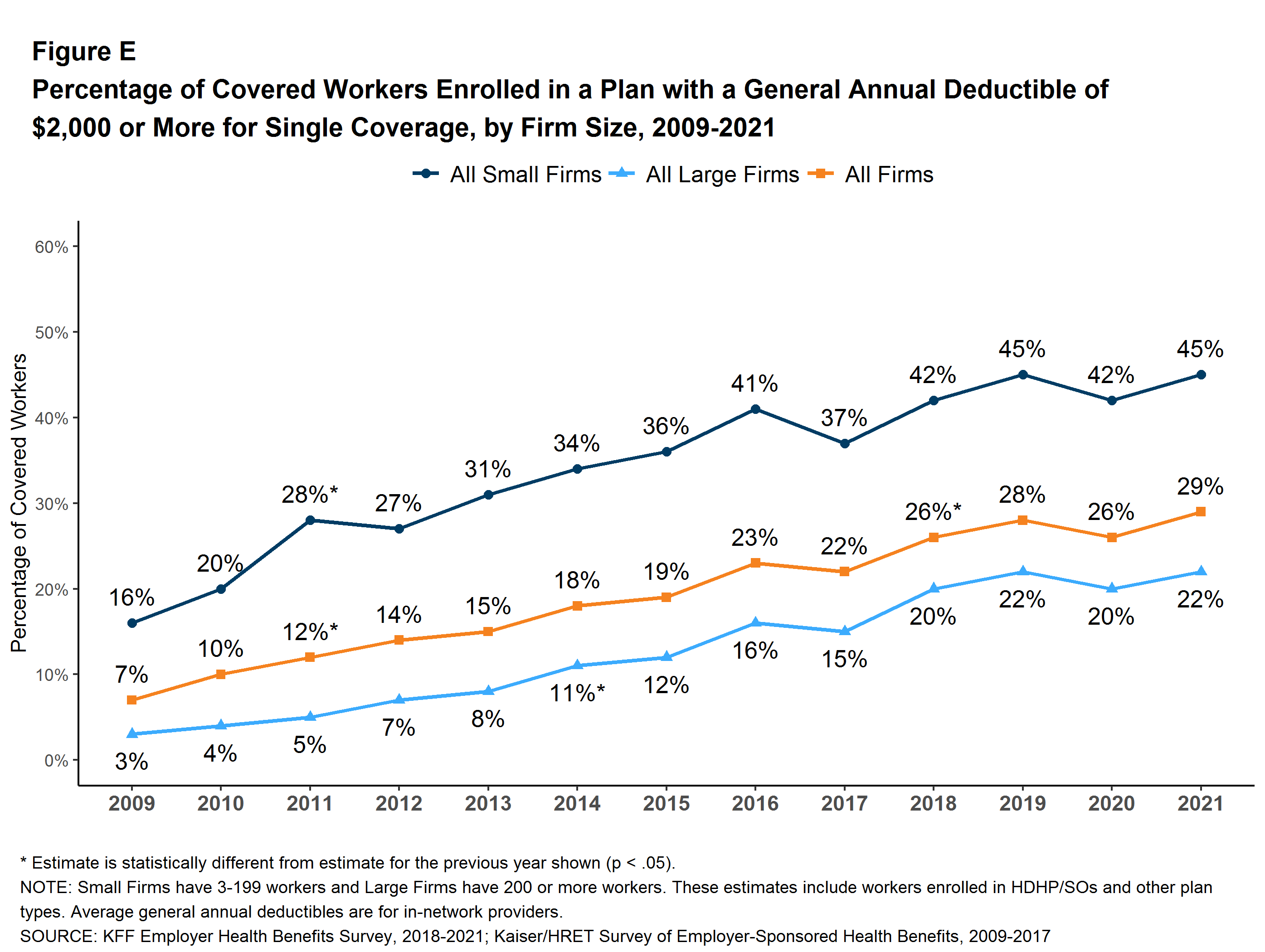 Figure E: Percentage of Covered Workers Enrolled in a Plan With a General Annual Deductible of $2,000 or More for Single Coverage, by Firm Size, 2009-2021