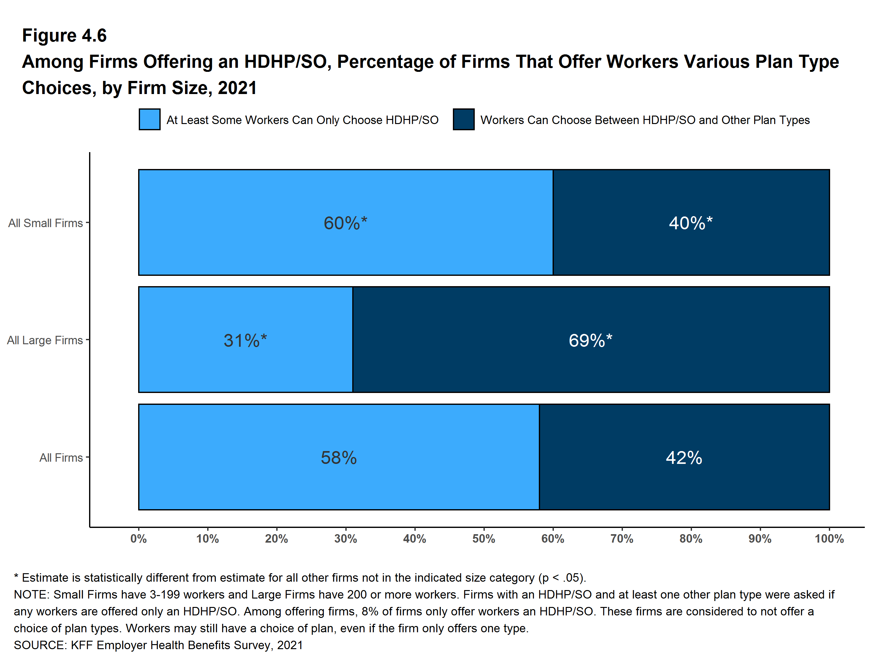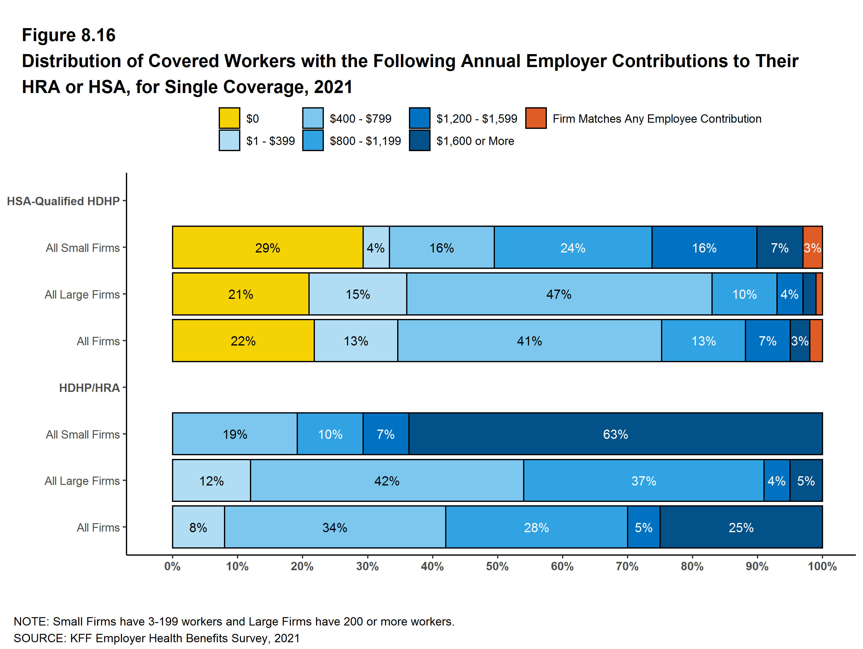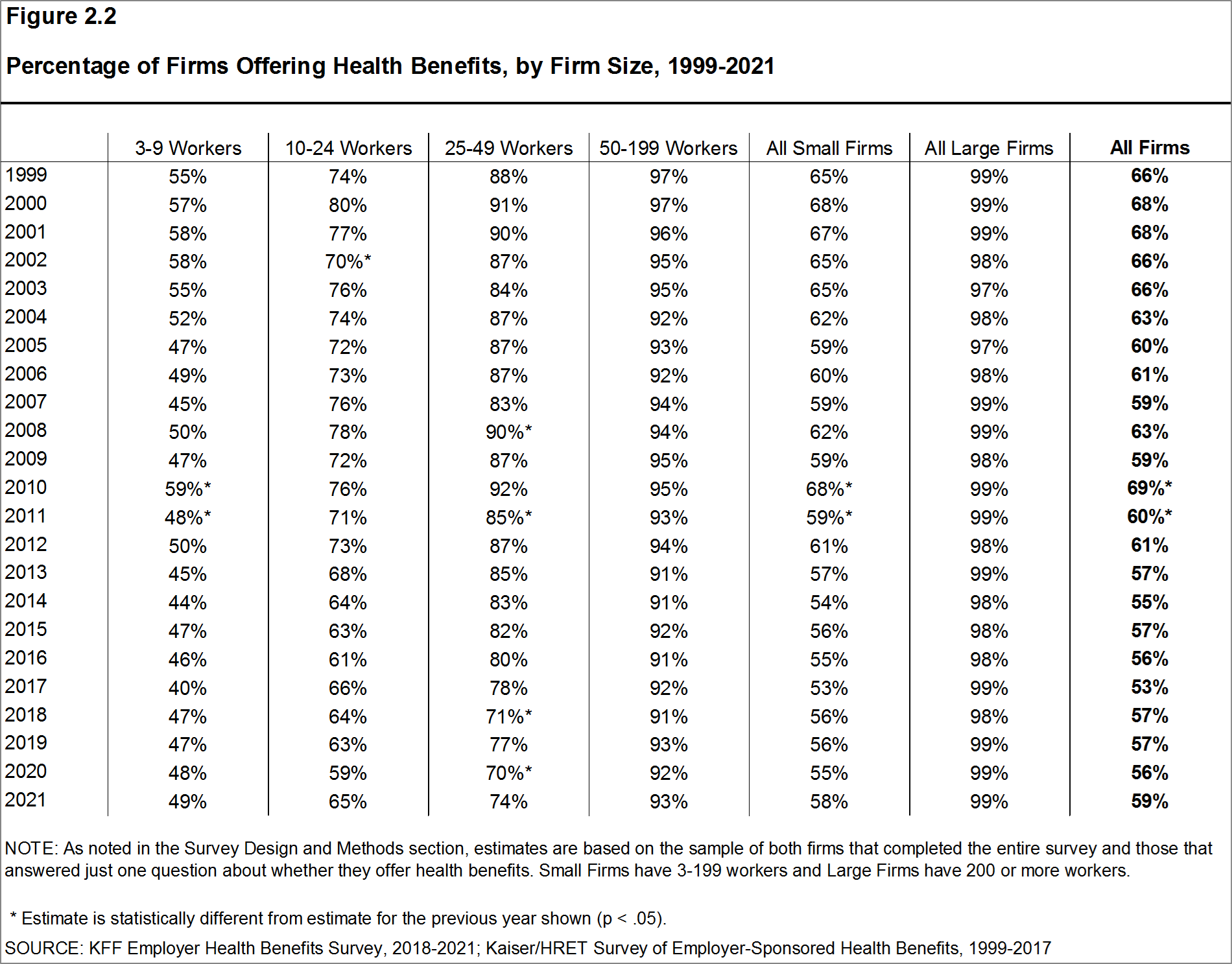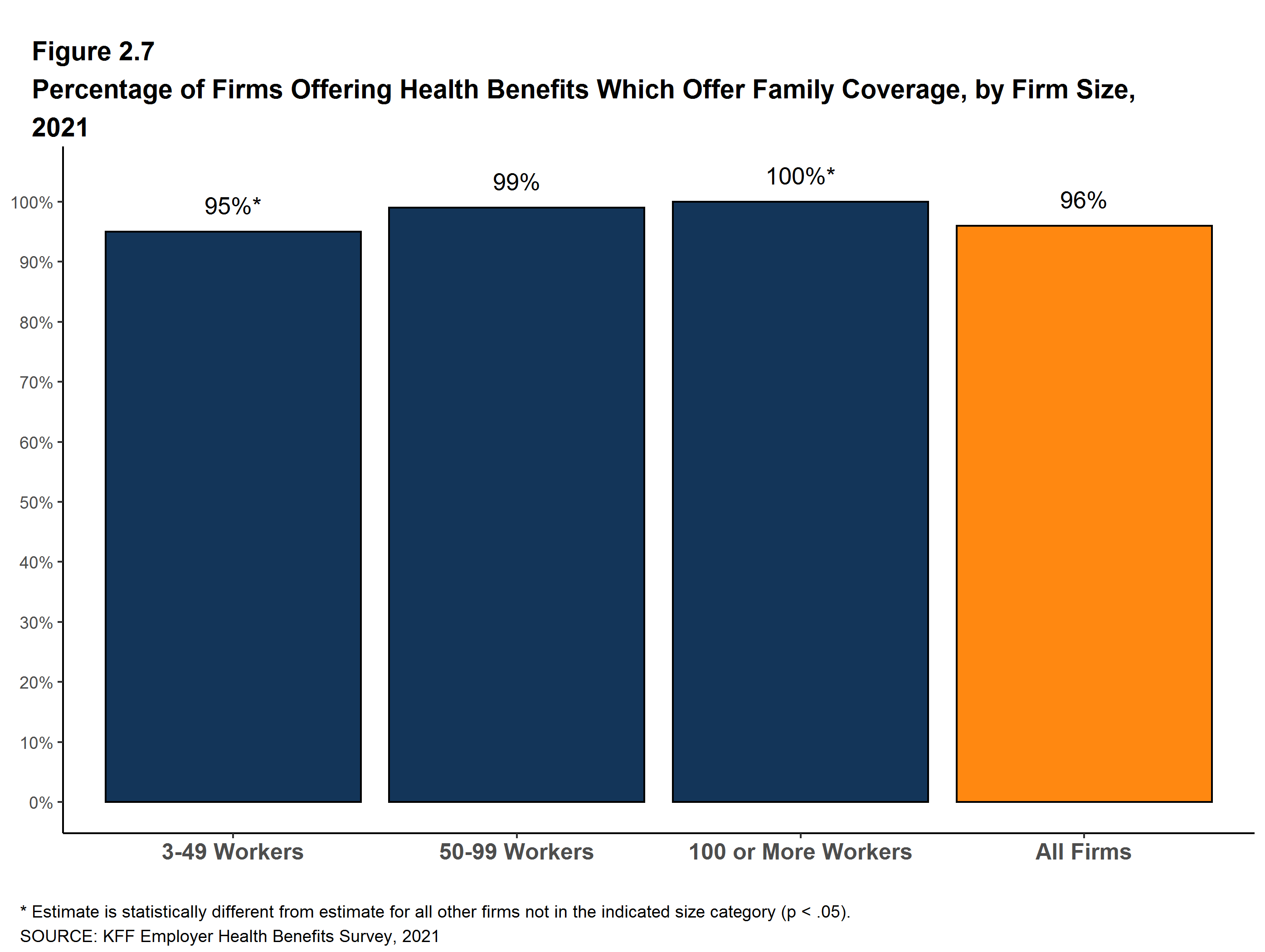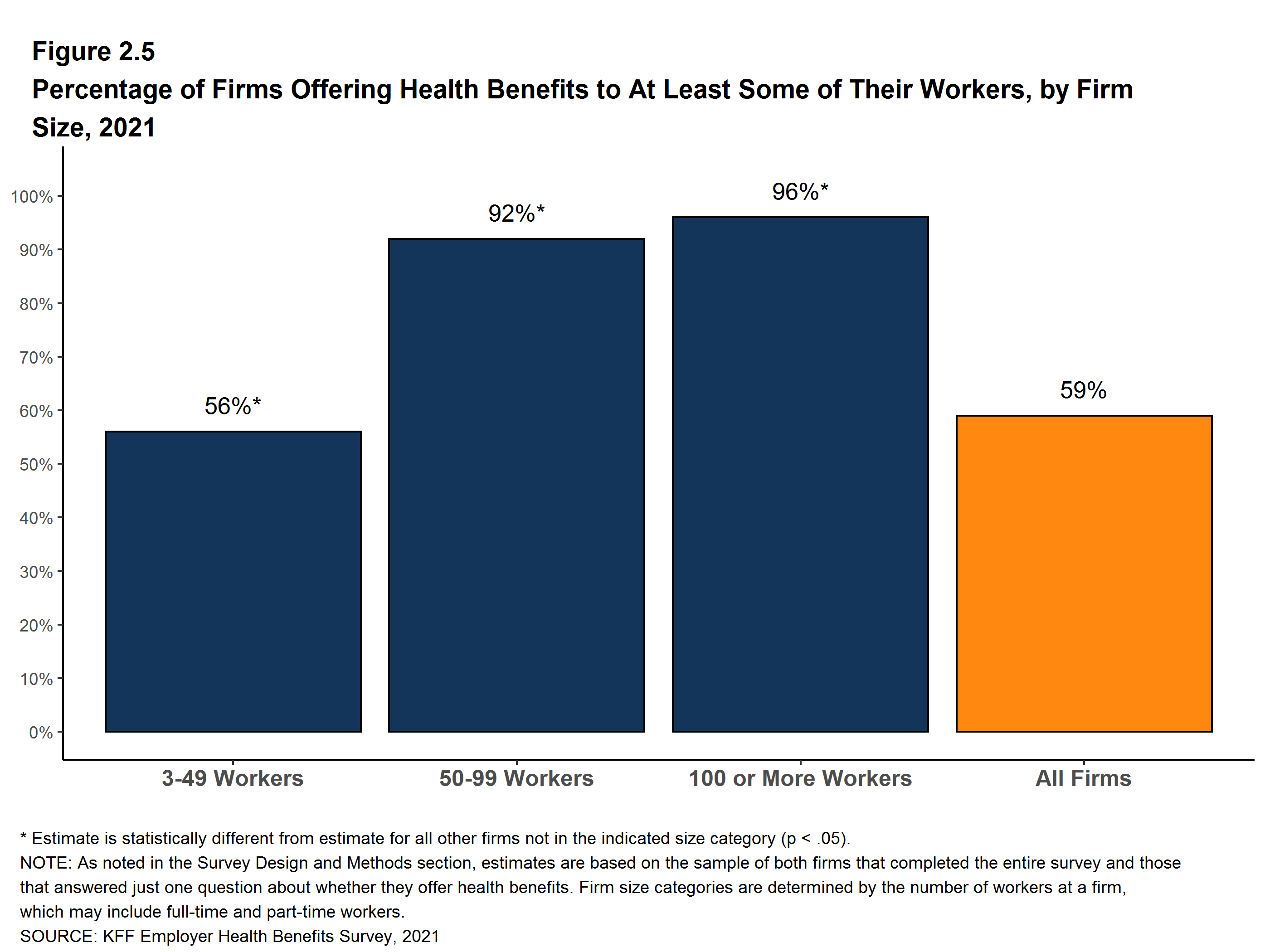 While the vast majority of firms are small, most workers work for large firms that offer coverage. In 2021, 91% of workers are employed by a firm that offers health benefits to at least some of its workers.