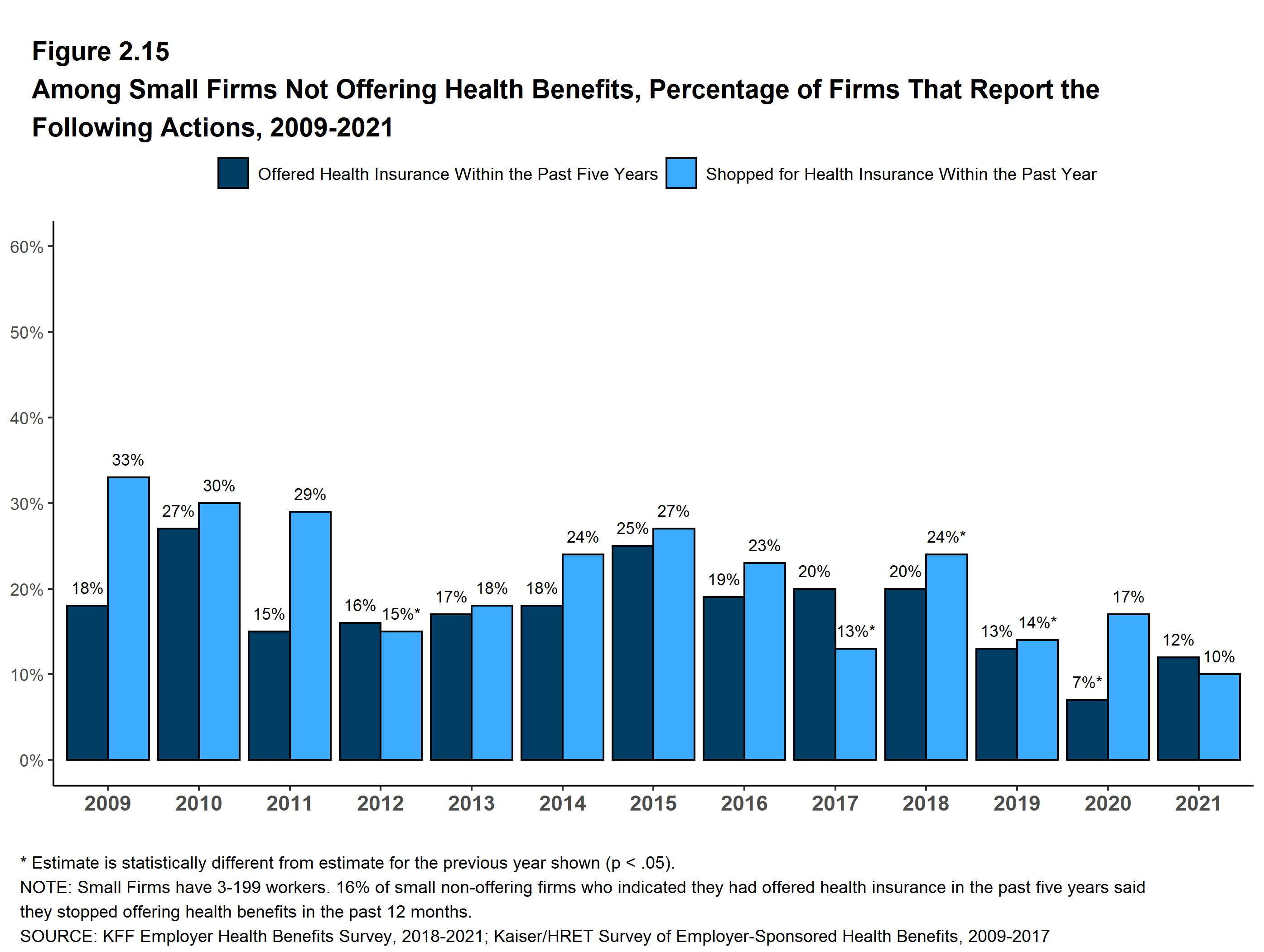 Figure 13.1: Percentage of Firms Offering Health Benefits That Shopped for a New Plan or Health Insurance Carrier in the Past Year, by Firm Size, 2021