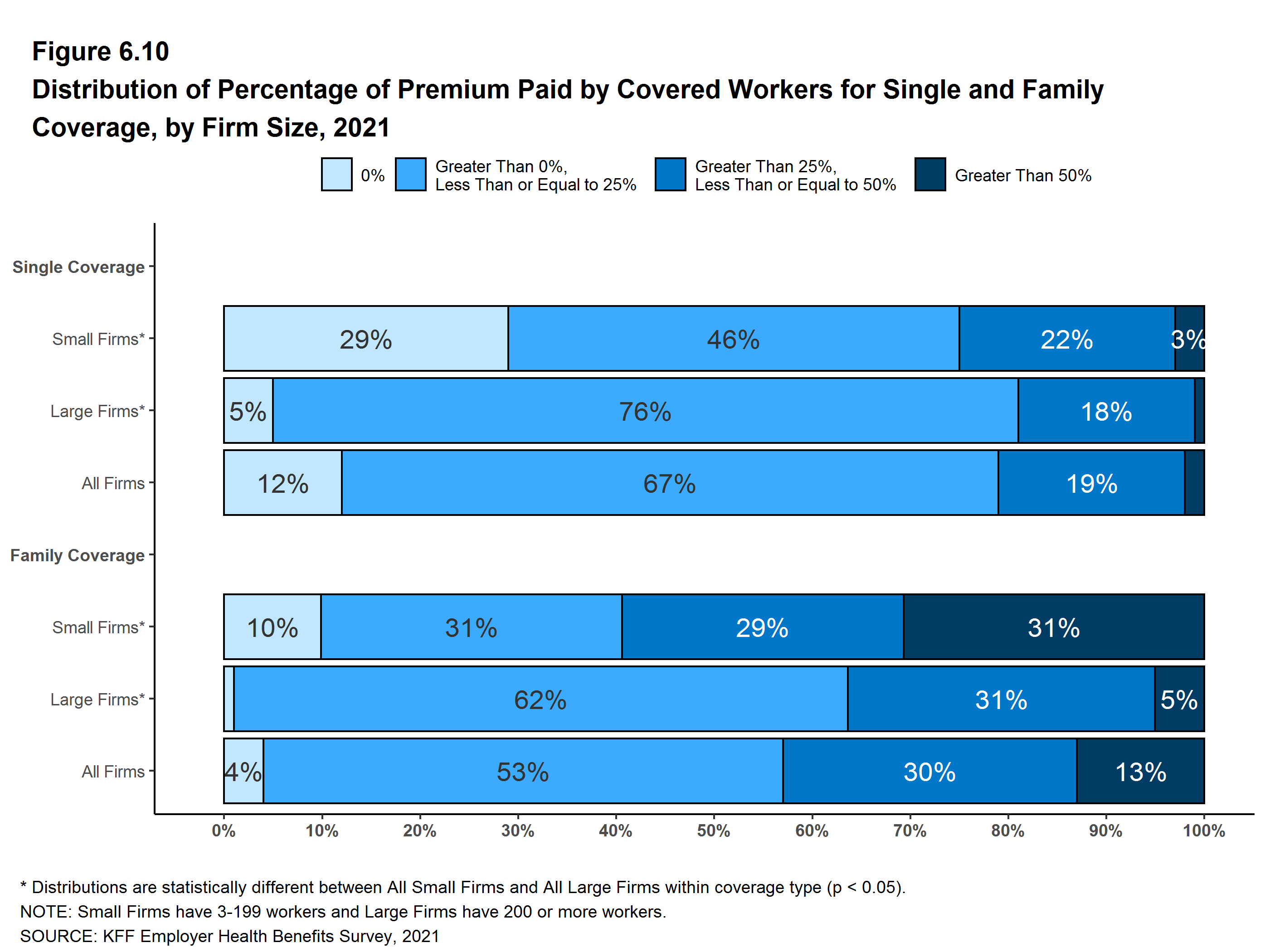 Twenty-nine percent of covered workers in small firms are in a plan where the employer pays the entire premium for single coverage, compared to only 5% of covered workers in large firms. In contrast, 31% of covered workers in small firms are in a plan where they must contribute more than one-half of the premium for family coverage, compared to 5% of covered workers in large firms [Figure C].