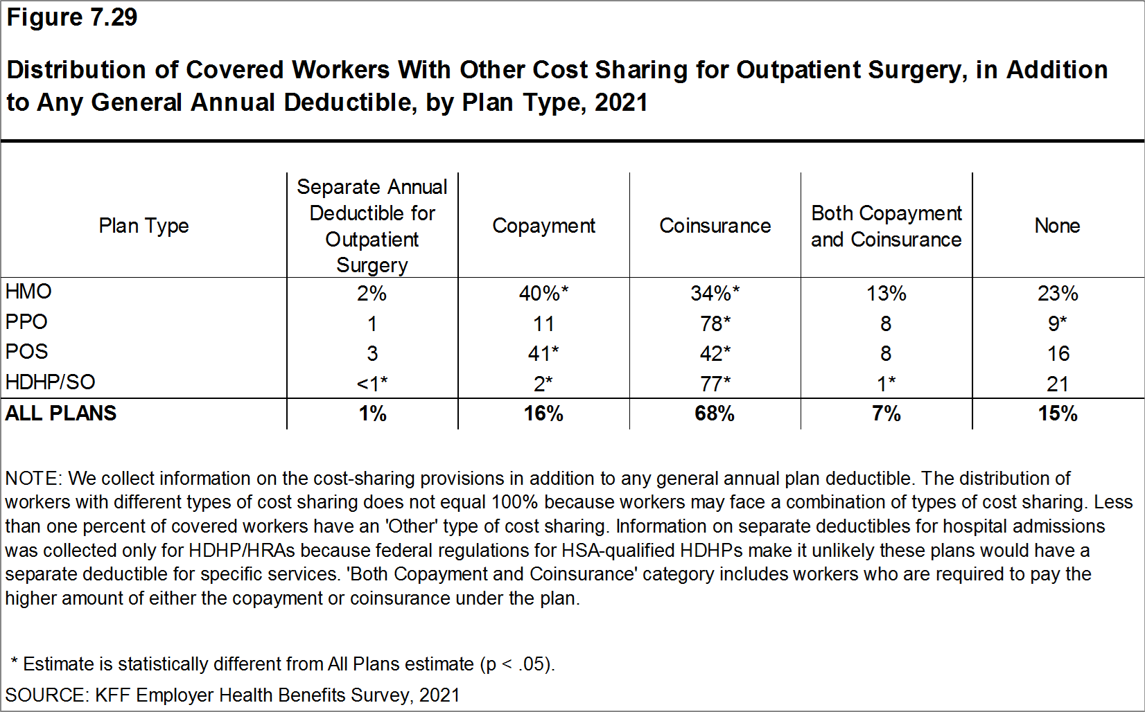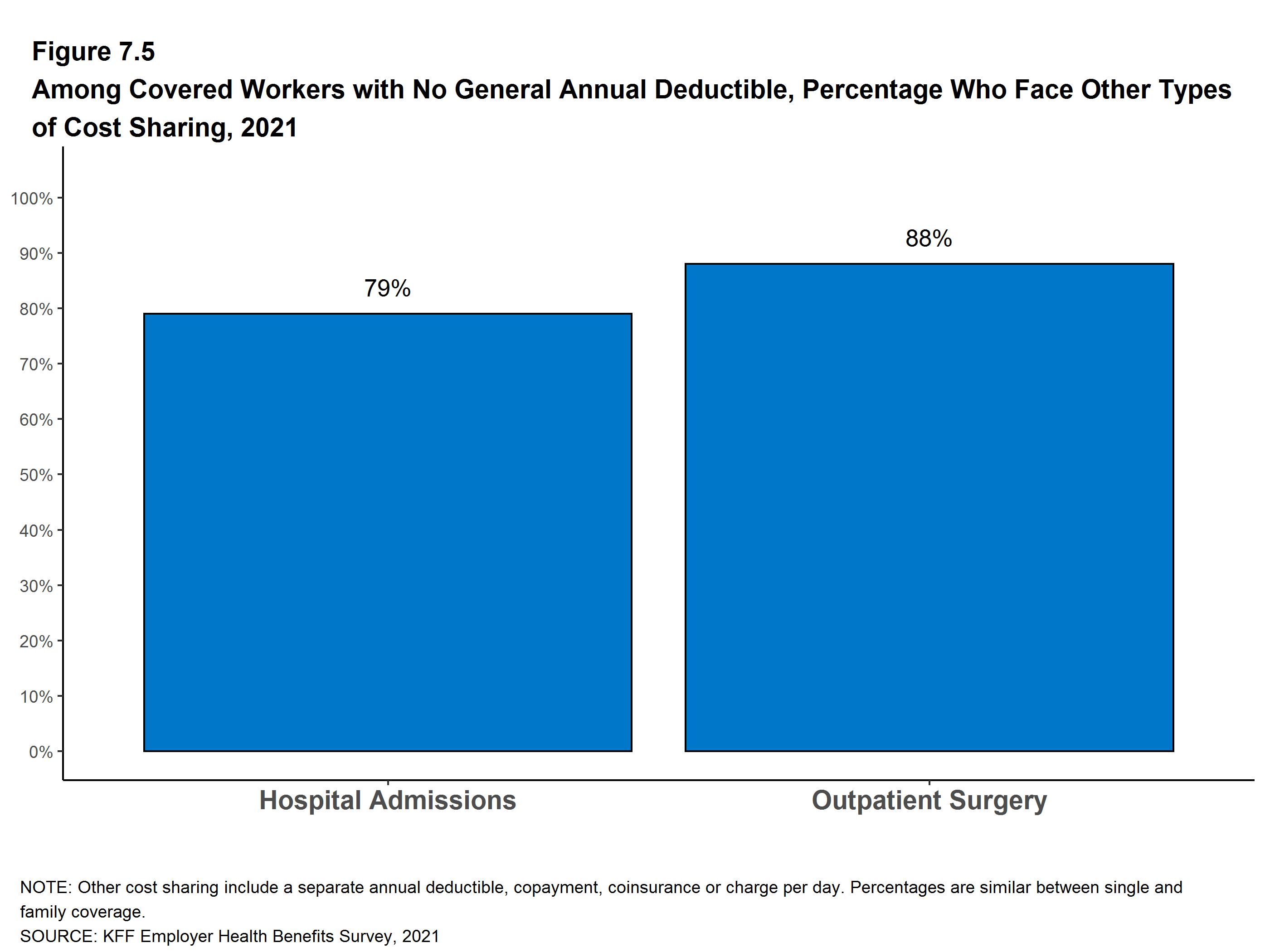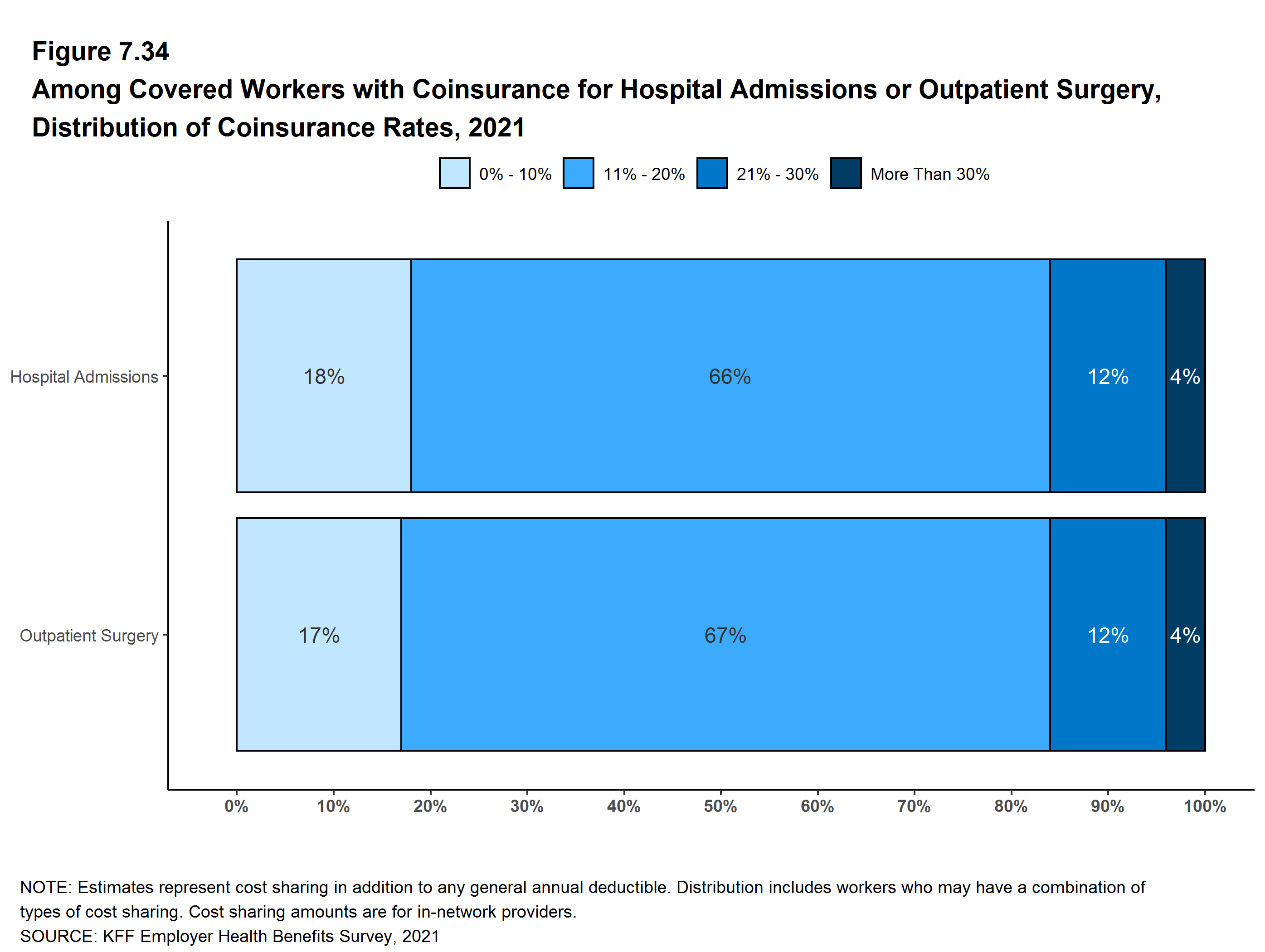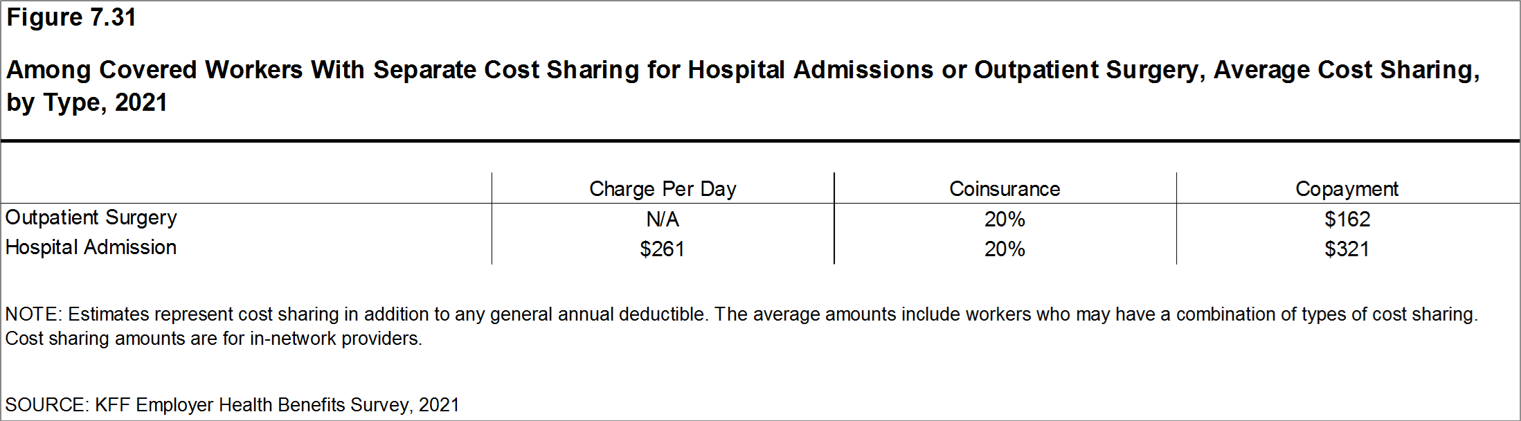 Most workers also face additional cost sharing for a hospital admission or outpatient surgery. Sixty-eight percent of covered workers have coinsurance and 12% have a copayment for hospital admissions. The average coinsurance rate for a hospital admission is 20% and the average copayment is $321 per hospital admission. The cost sharing requirements for outpatient surgery follow a similar pattern to those for hospital admissions.