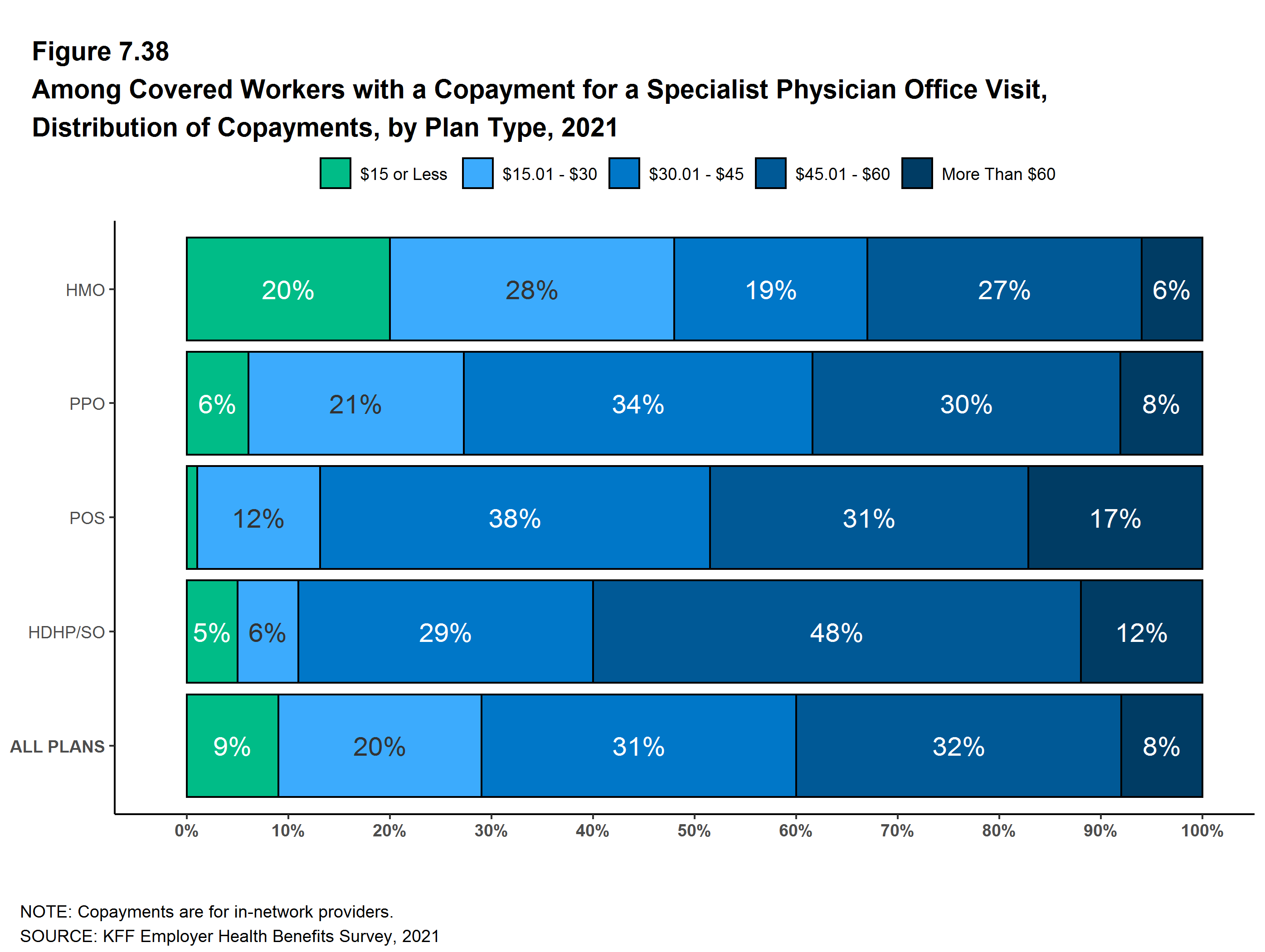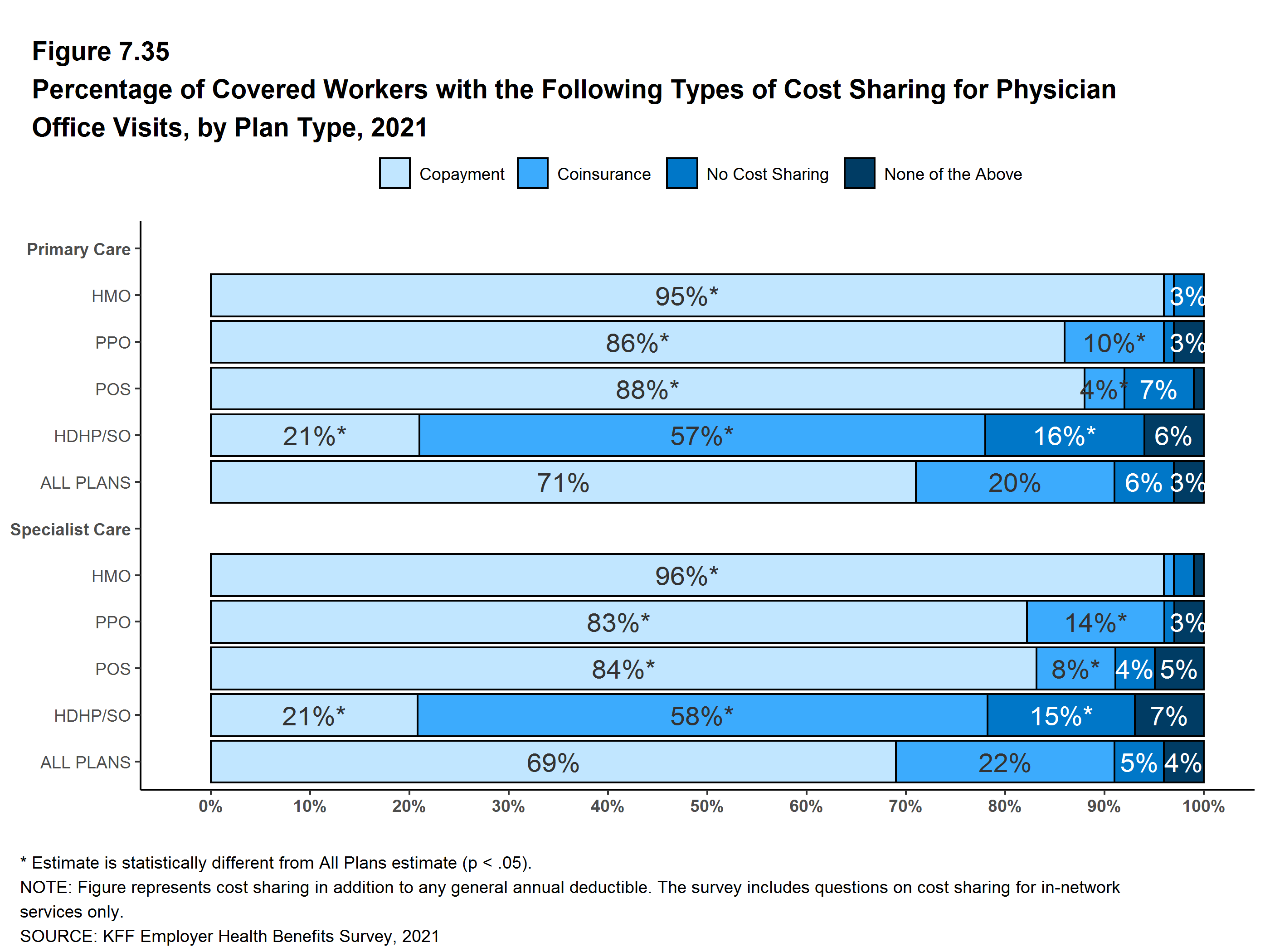 Whether or not a deductible applies, a large share of covered workers also pay a portion of the cost when they visit an in-network physician. Most covered workers face a copayment (a fixed dollar amount) when they visit a doctor, although some workers face coinsurance requirements (a percentage of the covered amount). The average copayments are $25 for primary care and $42 for specialty care. The average coinsurance rates are 19% for primary care and 20% for specialty care. These amounts are similar to those in 2020.