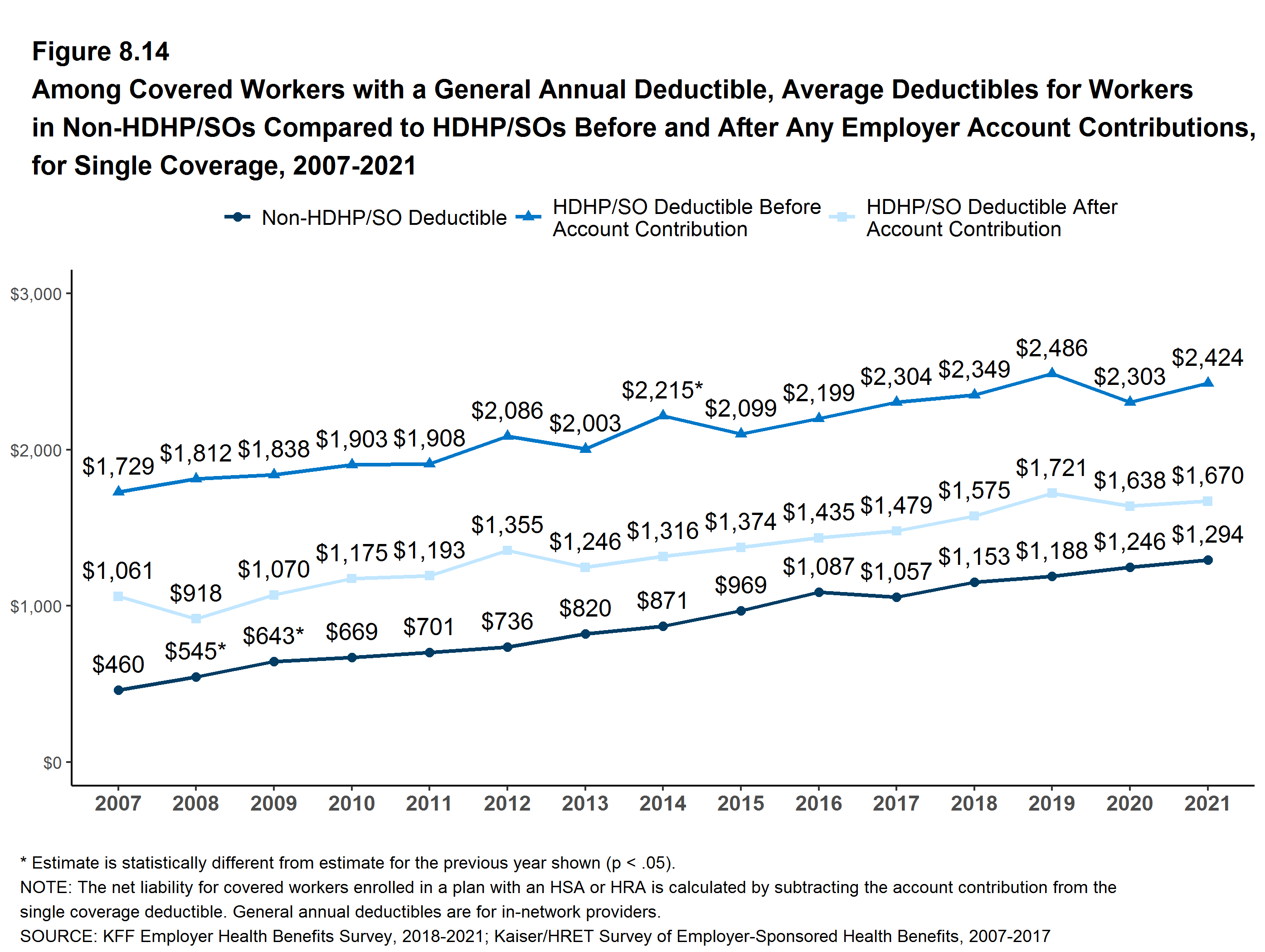 Deductibles have increased in recent years due to both higher deductibles within plan types and higher enrollment in HDHP/SOs. While growing deductibles in PPOs and other plan types generally increase enrollee out-of-pocket liability, the shift to enrollment in HDHP/SOs does not necessarily do so if HDHP/SO enrollees receive an offsetting account contribution from their employers. Twenty-seven percent of covered workers in an HDHP with a Health Reimbursement Arrangement (HRA), and 2% of covered workers in a Health Savings Account (HSA)-qualified HDHP receive an account contribution for single coverage at least equal to their deductible, while another 20% of covered workers in an HDHP with an HRA and 17% of covered workers in an HSA-qualified HDHP receive account contributions that, if applied to their deductible, would reduce their actual liability to less than $1,000.