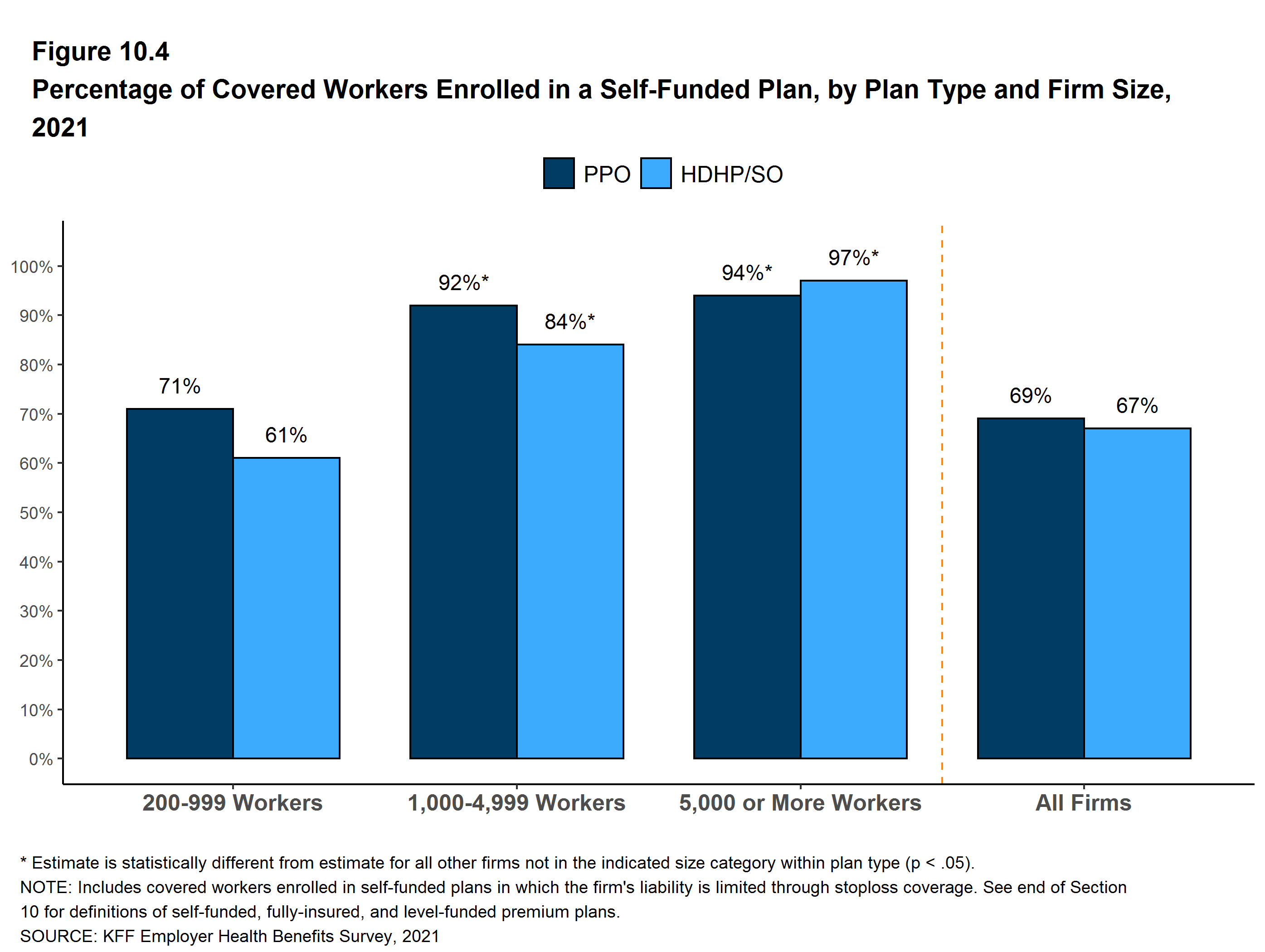 Many firms, particularly larger firms, self fund, or pay for some or all health services for their workers directly from their own funds rather than by purchasing health insurance.Sixty-four percent of covered workers, including 21% of covered workers in small firms and 82% in large firms, are enrolled in plans that are self-funded. The percentage of firms offering health benefits that are self funded in 2021 is similar to the percentage last year.
