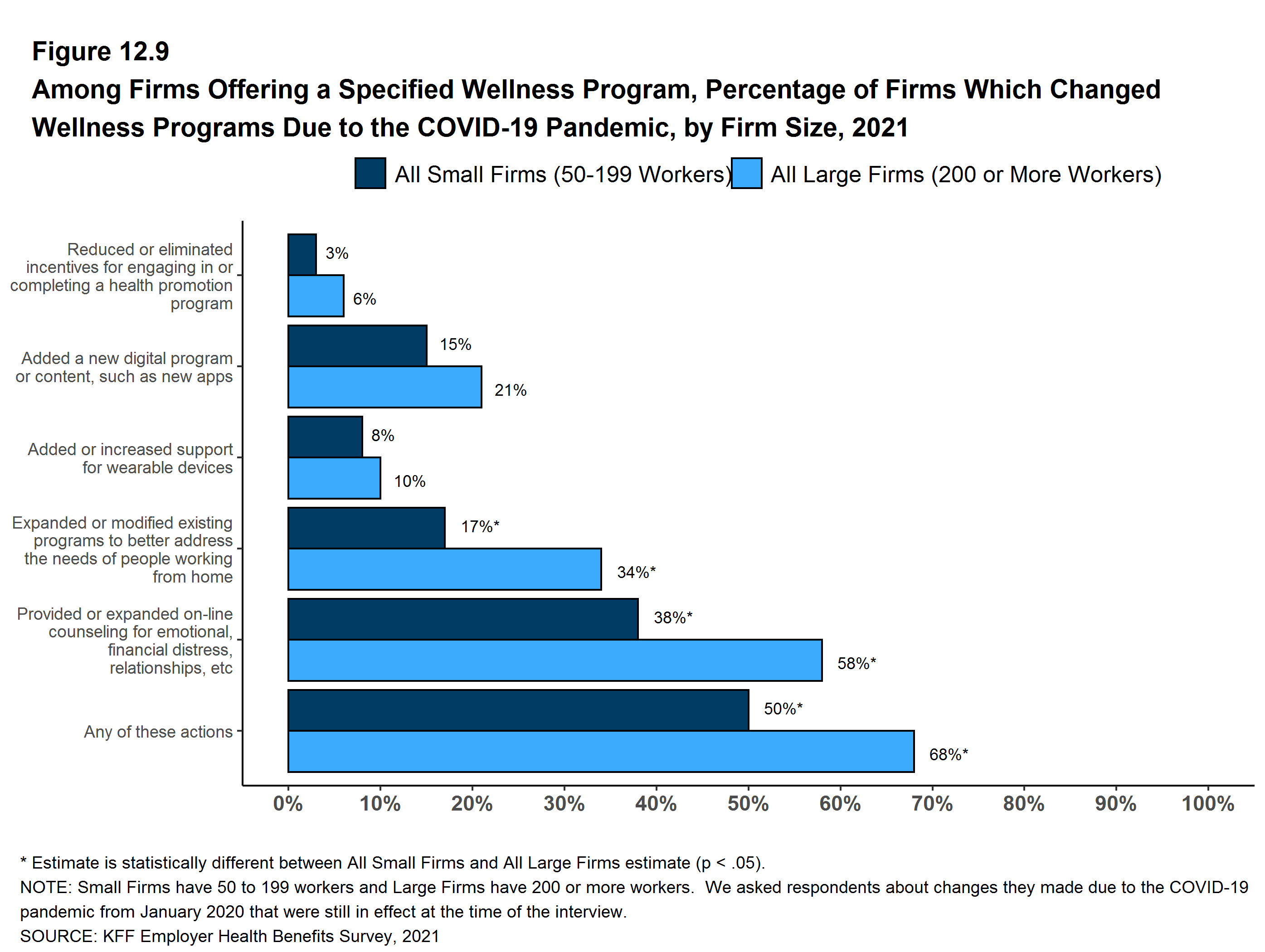 - Firms with 50 or more employees with a wellness or health promotion program were asked if they made changes to their programs since the beginning of the COVID-19 pandemic. Overall, 50% of smaller firms (50-199 employees) and 68% of larger firms reported some type of change.