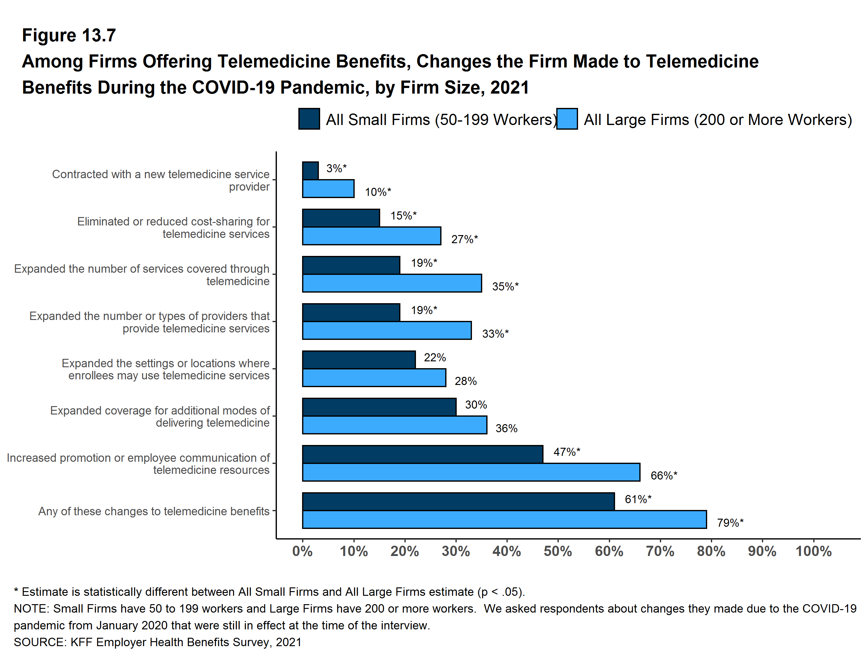 Figure 13.7: Among Firms Offering Telemedicine Benefits, Changes the Firm Made to Telemedicine Benefits During the COVID-19 Pandemic, by Firm Size, 2021