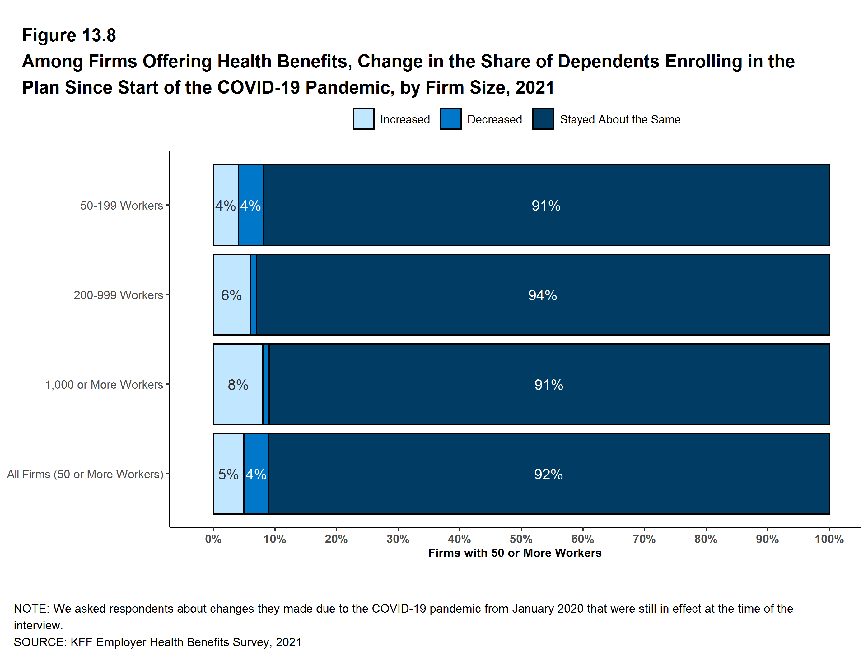 Figure 13.8: Among Firms Offering Health Benefits, Change in the Share of Dependents Enrolling in the Plan Since Start of the COVID-19 Pandemic, by Firm Size, 2021