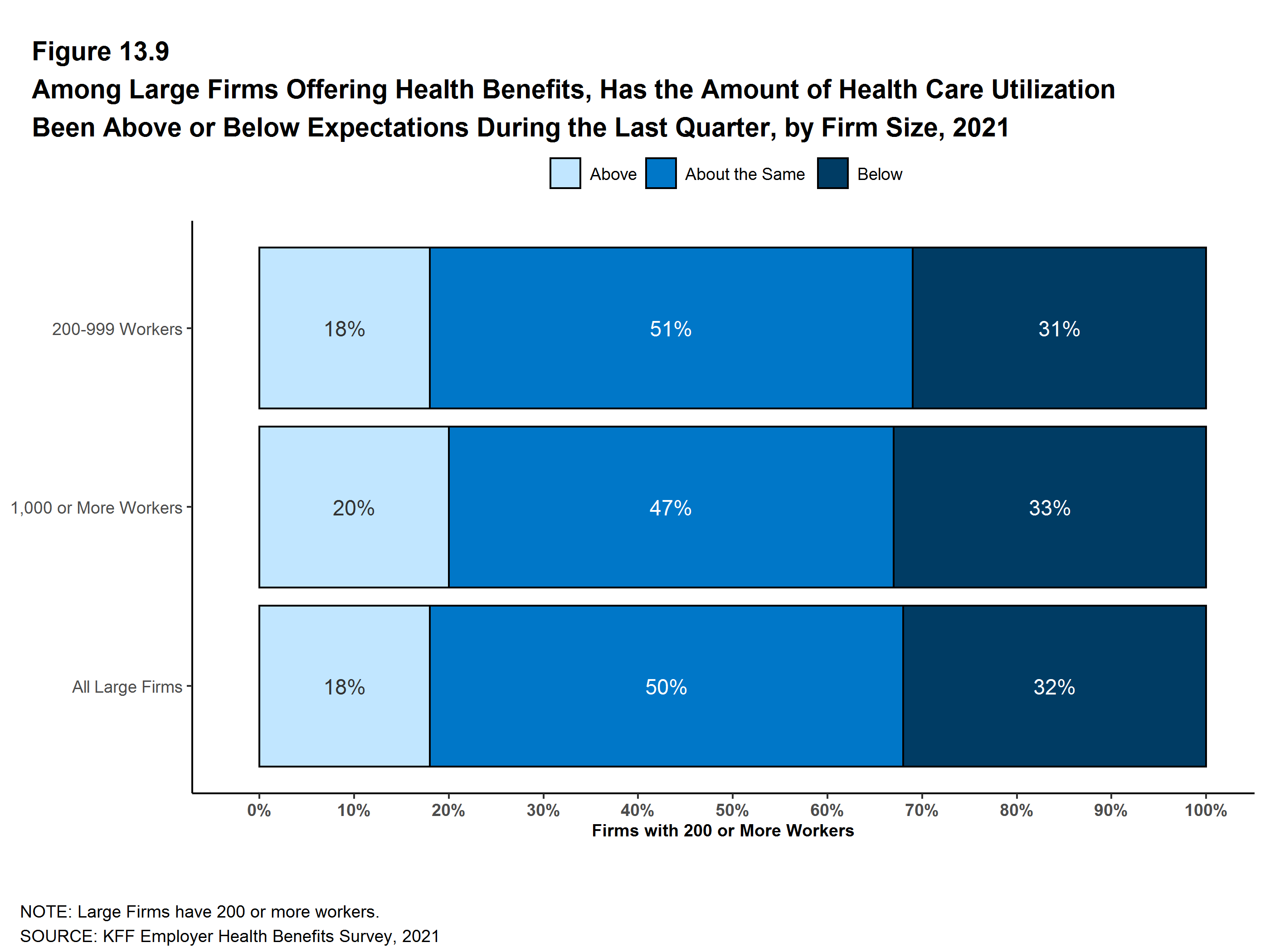 Figure 13.9: Among Large Firms Offering Health Benefits, Has the Amount of Health Care Utilization Been Above or Below Expectations During the Last Quarter, by Firm Size, 2021
