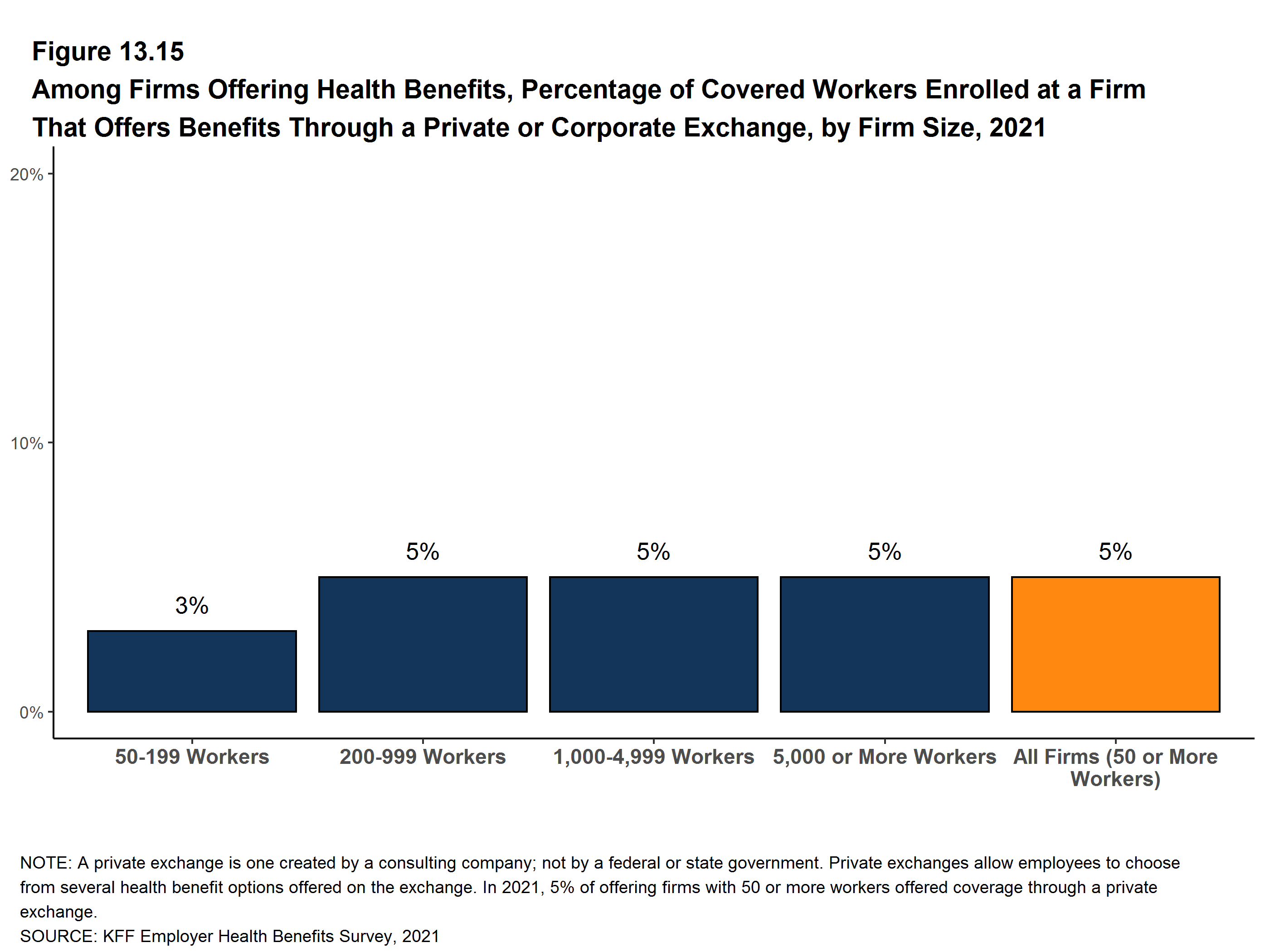 Figure 13.15: Among Firms Offering Health Benefits, Percentage of Covered Workers Enrolled at a Firm That Offers Benefits Through a Private or Corporate Exchange, by Firm Size, 2021