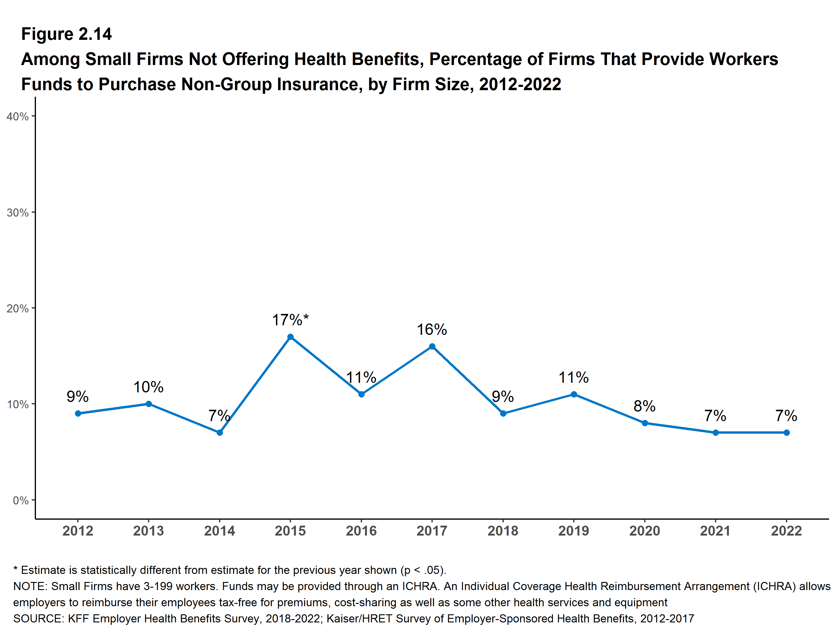 While nearly all large firms (firms with 200 or more workers) offer health benefits to at least some workers, small firms (3-199 workers) are significantly less likely to do so. In 2022, 51% of all firms offered some health benefits. This is lower than the percentage of firms offering health benefits last year (59%) but similar to the percentage five years ago (53%).