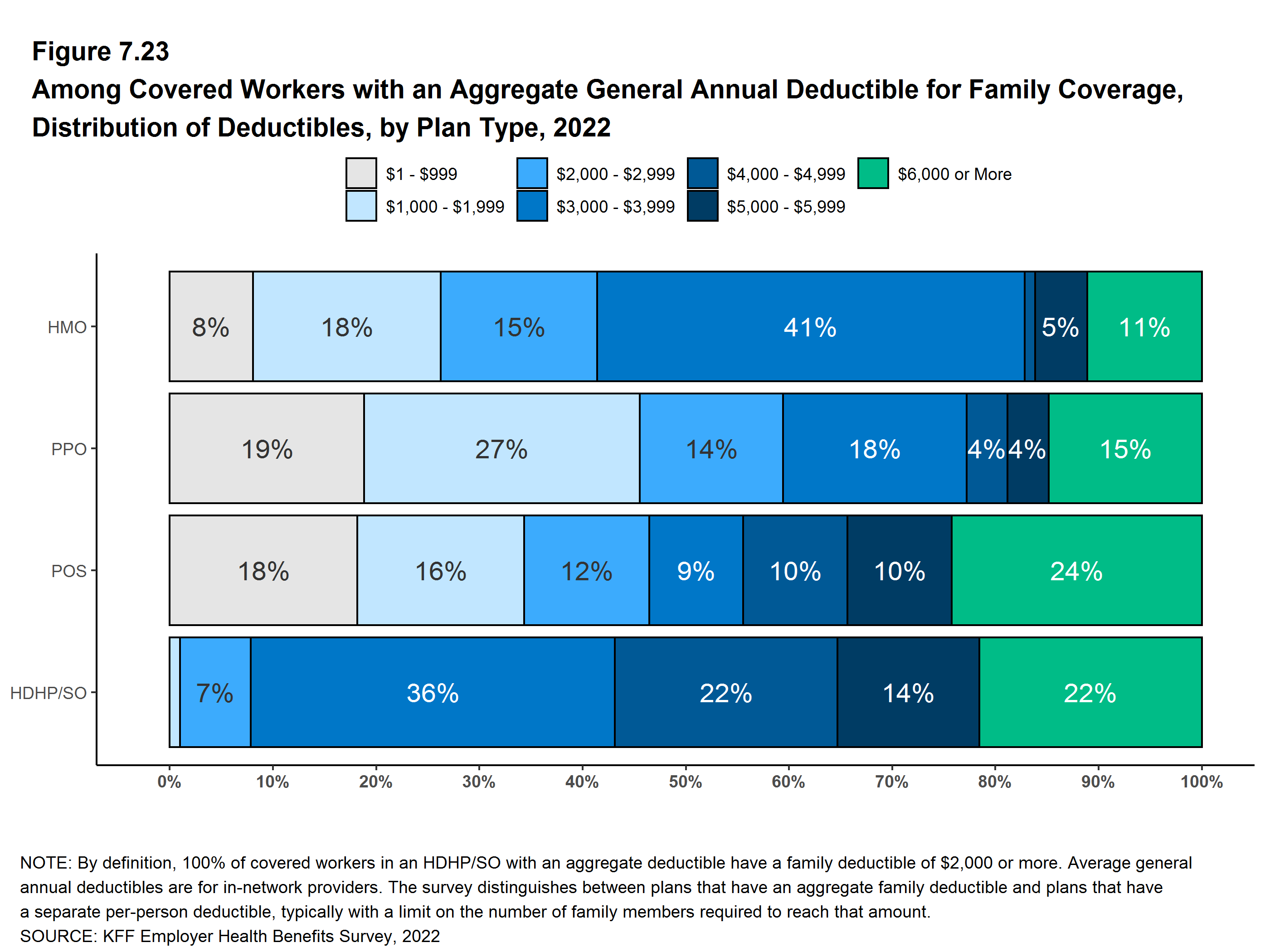 Among workers with single coverage and a general annual deductible, the average deductible amount is $1,763, similar to last year. The average deductible for covered workers is much higher at small firms than large firms ($2,543 vs. $1,493). Among workers with single coverage and any deductible, the average deductible amount has increased 17% over the last five years and 61% over the last ten years.In five years, the percentage of covered workers with a general annual deductible of $2,000 or more for single coverage has grown from 22% to 32% [Figure F].