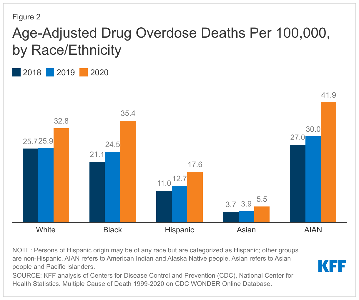 Drug overdose death rates increased across all racial and ethnic groups in recent years, but these increases were larger for people of color compared to their White counterparts. Reflecting these increases, drug overdose death rates among Black people surpassed rates of White people by 2020 (35.4 versus 32.8 per 100,000) (Figure 2). However, AIAN people continued to experience the highest rates of drug overdose deaths (41.9 per 100,000 in 2020) compared with all other racial and ethnic groups. Among adolescents, deaths due to drug overdose nearly doubled in 2020 and disproportionately affected adolescents of color. Further, it is possible that deaths by suicide are being undercounted due to misclassifications as drug overdose deaths. Fentanyl-related deaths, which have accounted for many drug overdose deaths during the pandemic, may be disproportionately affecting Black communities.