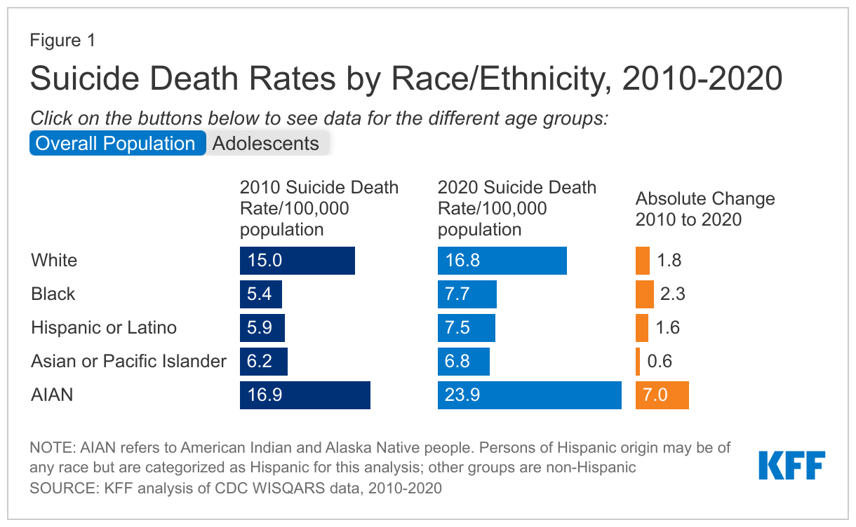 Between 2010 and 2020, Black and American Indian or Alaska Native (AIAN) people experienced the largest increases in rates of death by suicide (Figure 1). AIAN and White people continue to experience the highest rates of deaths by suicide compared to all other racial and ethnic groups (23.9 and 16.8 per 100,000 in 2020, respectively). However, people of color are experiencing the largest increases in rates of death by suicide. AIAN and Black people experienced the largest absolute increases in suicide death rates (7.0 and 2.3 percentage points, respectively) from 2010 to 2020 (Figure 1). Moreover, Black and Hispanic people had larger percentage increases in their suicide death rates compared to White people over the same period (at 43% and 27%, respectively, compared to 12%).