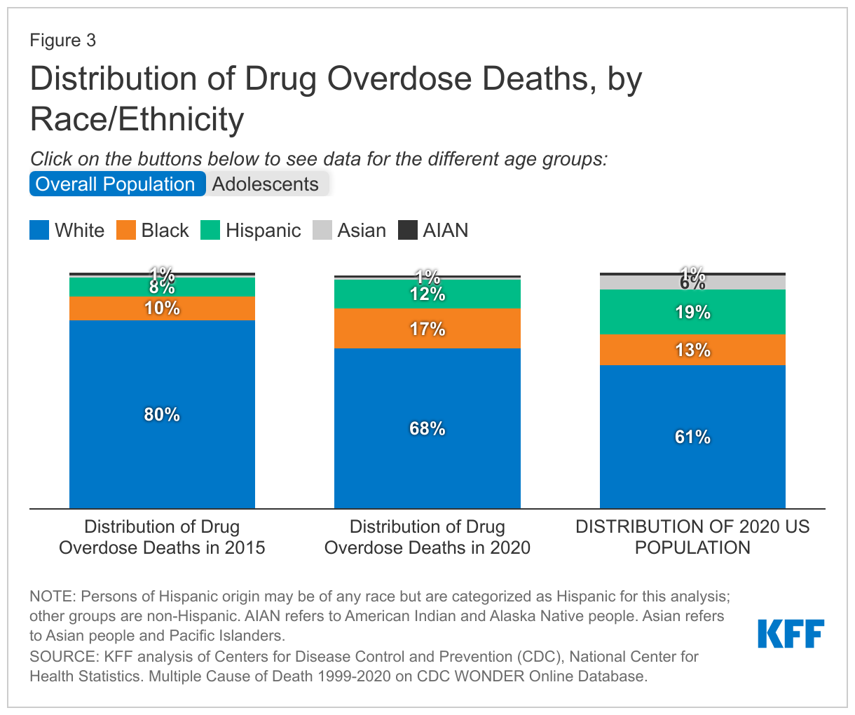 White people continue to account for the largest share of deaths due to drug overdose, but people of color are accounting for a growing share of these deaths over time. Between 2015 and 2020, the share of drug overdose deaths among White people fell, while at the same time the shares of these deaths among Black and Hispanic people rose. As a result of this increase, Black people accounted for a disproportionate share of drug overdose deaths relative to their share of the total population in 2020 (17% vs. 13%) (Figure 3). Similarly, reflecting an increase in deaths over the period, Hispanic adolescents accounted for a disproportionate share of drug overdose deaths relative to their share of the population as of 2020 (30% vs. 25%). These recent trends are contributing to emerging disparities in drug overdose deaths among some people of color, which may worsen if they continue.
