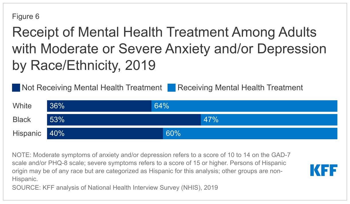 Leading up to the pandemic, people of color faced disparities in access to and receipt of mental health care, which may have worsened during the pandemic. While similar shares of White, Black, and Hispanic adults reported moderate to severe symptoms of anxiety and/or depression in 2019, a much larger share of Black adults (53%) with these symptoms did not receive care compared to their White (36%) counterparts (Figure 6). Other research shows Black and Hispanic people with mental illness or substance use disorder are less likely to receive treatment compared to the overall population.
