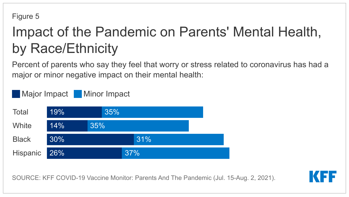 The COVID-19 pandemic has disproportionately impacted people of color in multiple ways that contribute to poor mental health (Figure 5). Compared to their White peers, people of color have experienced higher rates of COVID-19 infection and death and greater financial challenges, including difficulty paying household bills, during the pandemic, which may negatively impact their mental health. KFF COVID-19 Vaccine Monitor Survey data from late 2021 found that at least half of White, Hispanic, and Black adults said the pandemic negatively impacted their mental health. Additional KFF survey data suggests that the mental health of Black and Hispanic parents has been particularly negatively impacted. At least six in ten Black and Hispanic parents say stress related to the pandemic had a negative impact on their mental health compared to less than half of White parents (Figure 5). Further, Black and Asian people have reported negative mental health impacts due to heightened anti-Black and anti-Asian racism and violence during the pandemic.