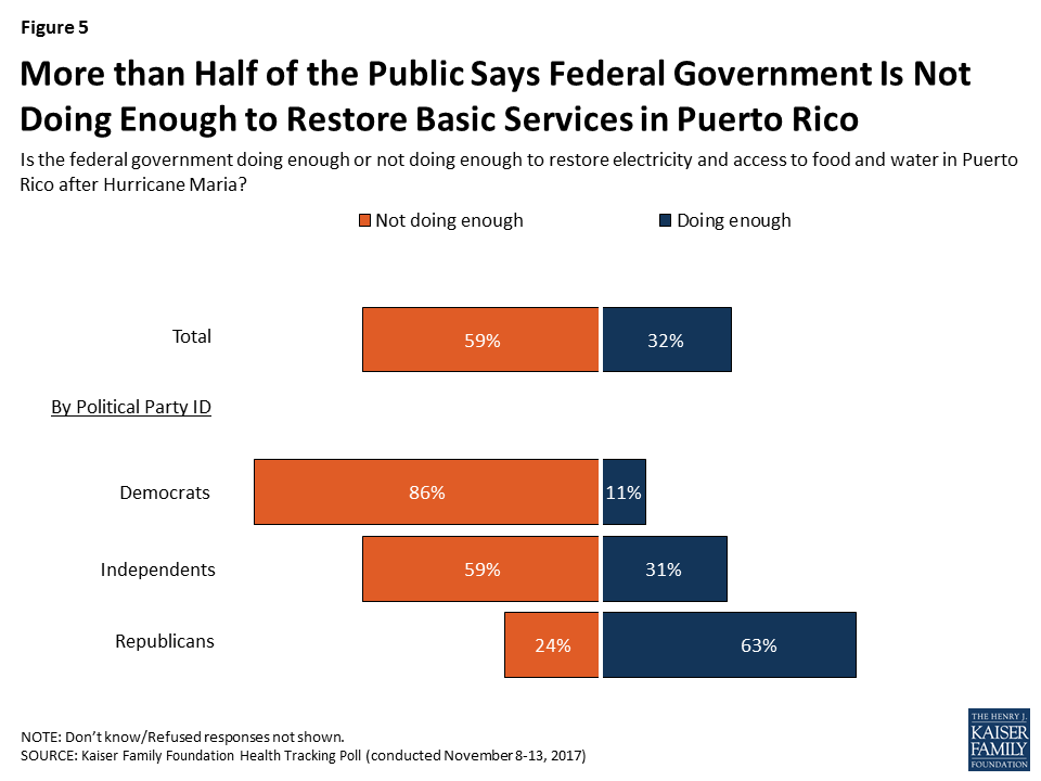 In an ongoing effort to track the public’s awareness and perceptions of the impact of Hurricane Maria on people in Puerto Rico, the November Kaiser Health Tracking poll finds that most of the public (63 percent) says they are closely following news about the recovery effort. Compared to last month, and now two months after the hurricane made landfall on the island, more of the public now says people in Puerto Rico are not yet getting needed help, rising from 62 percent in October to 70 percent this month. These views vary considerably by party, but this month half of Republicans (52 percent) also say people are not yet getting the help they need, up from 38 percent in October. Similarly, most of the public (59 percent) says the federal government is not doing enough to restore electricity and access to food and water in Puerto Rico; again, slightly higher than the share last month (52 percent). On this point, most Republicans (63 percent) feel the federal government is doing enough, while majorities of independents (59 percent) and Democrats (86 percent) feel it is not.