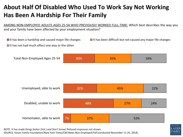 Overall, the survey paints a portrait of a diverse group of Americans who are out of the workforce. This report focus on three main categories within the non-employed: those who say they have a disability that prevents them from working, those who are able to work and consider themselves unemployed, and those who are able to work and call themselves homemakers. (In a few places, it draws on data from the Kaiser Health Tracking Poll for comparisons to full-time workers in the same age range.) While most homemakers report that they are happy with their current situation, most of those who are disabled or unemployed say it is a source of stress, and that being out of work has been a hardship for them and their families. These latter two groups report a variety of negative impacts of being out of work in terms of health, relationships, and finances. The survey finds that most of those who are unemployed and looking for work would be willing to make a variety of sacrifices to find a new job, including in some cases taking significant pay cuts. In addition, it finds that most homemakers say they plan to go back to work in the future, and that many would be more likely to return to the workforce now for jobs that provide flexible hours, the ability to work from home, or an increase in pay over their most recent job.