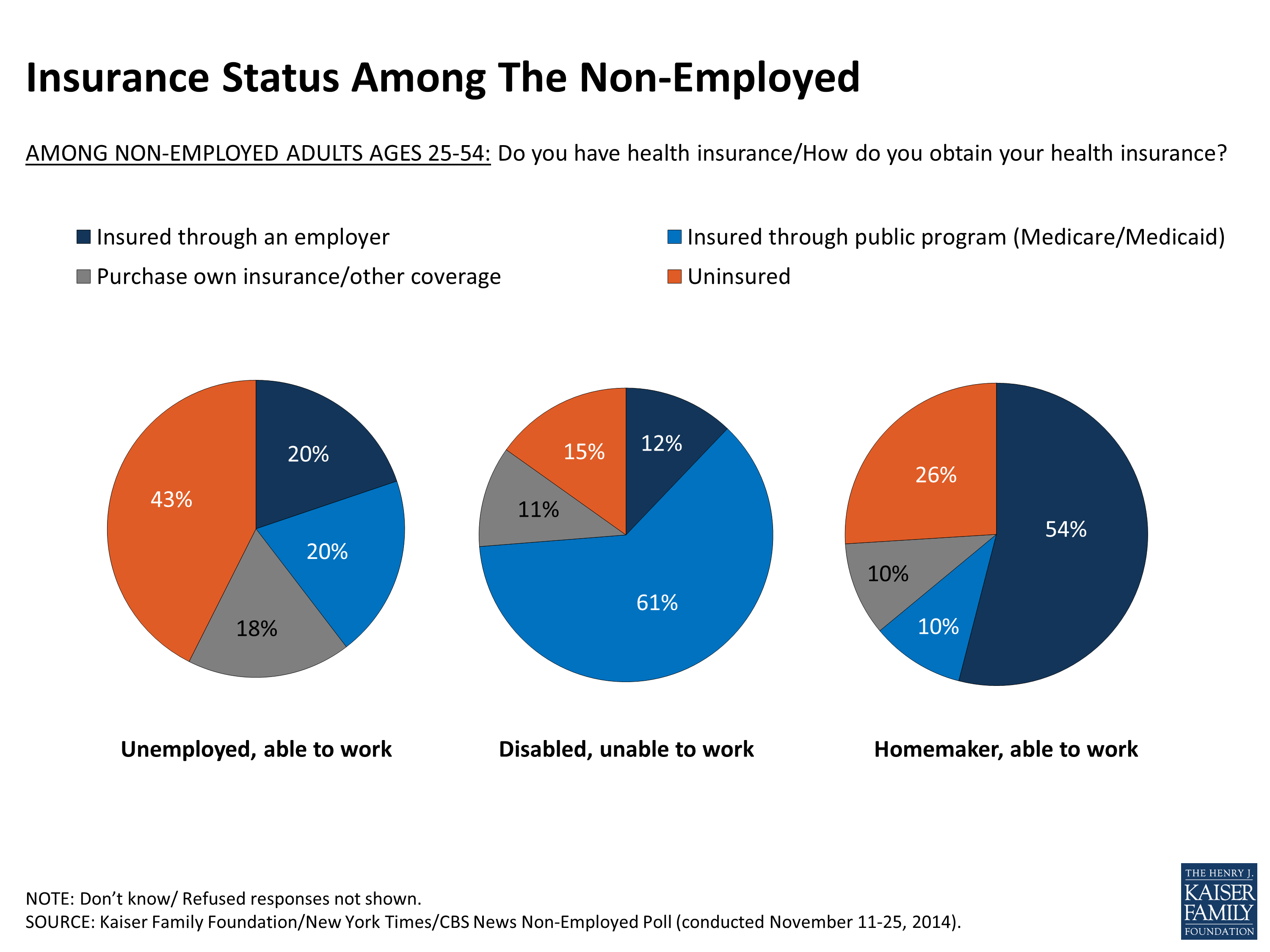 These groups also differ greatly in terms of likeliness to have health insurance and sources of coverage. Eighty-five percent of those with a disability say they have coverage, mostly through public programs (61 percent). Three-quarters (74 percent) of homemakers report getting coverage, most commonly through a spouse’s employer (54 percent). Those who are unemployed and able to work are much less likely to report being insured, with four in ten (43 percent) saying they have no health insurance coverage at all.