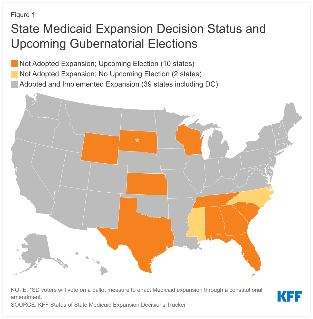 - Voters in South Dakota are expected to re-elect Republican Governor Kristi Noem – who has opposed expansion – but they will also vote on the ballot measure to enact Medicaid expansion through a constitutional amendment. If passed, the amendment would direct the state to expand Medicaid by July 1, 2023 with no additional eligibility restrictions. Noem has stated that if the initiative passes, she will make sure it is implemented fairly. While Medicaid expansion may not be a deciding issue for many voters, the outcome of these elections will have consequences for the chances of expansion moving ahead in these states.