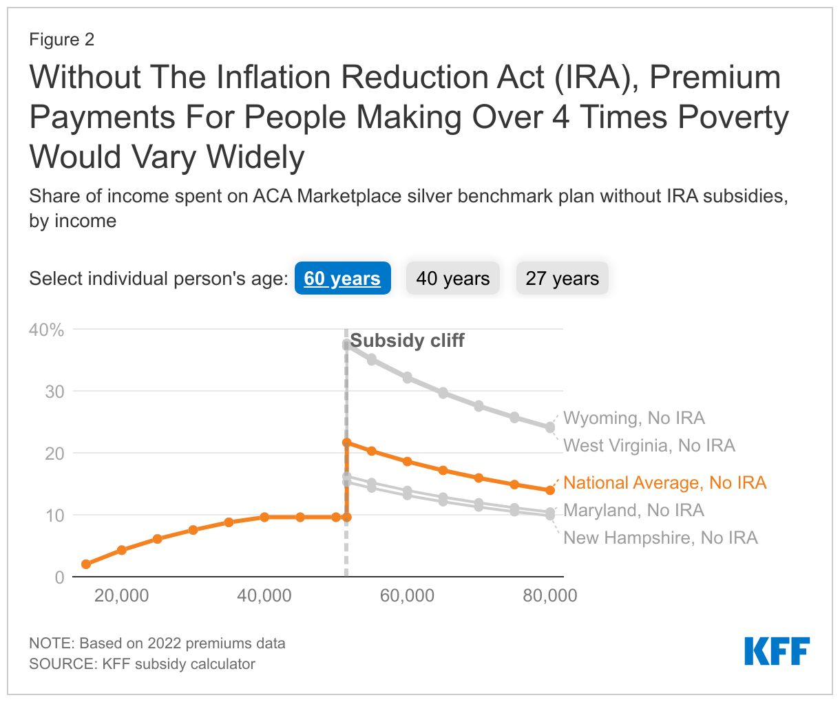 The figure below shows a hypothetical subsidy cliff if premiums do indeed rise by 10%. For example, a 60-year-old making just above four times poverty ($51,521) in 2022 pays 8.5% of their income on a silver plan with enhanced subsidies, but would have paid 22% of their income in 2022 without these subsidies on average across the U.S. If not for the Inflation Reduction Act, and if premiums rise 10% in 2023, this person would pay 24% of their income in 2023.