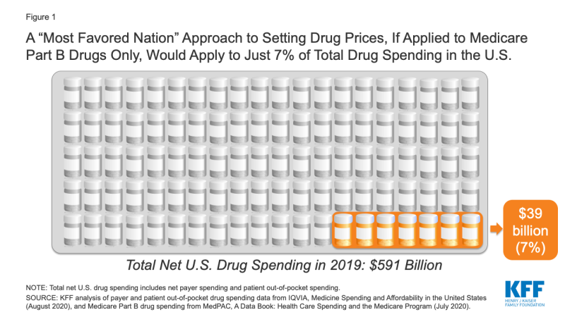 If the new executive order is similar to the 2018 proposal, and applies only to Medicare Part B drug spending, it would apply to just 7% of total national spending on prescription drugs, according to our analysis (Figure 1).