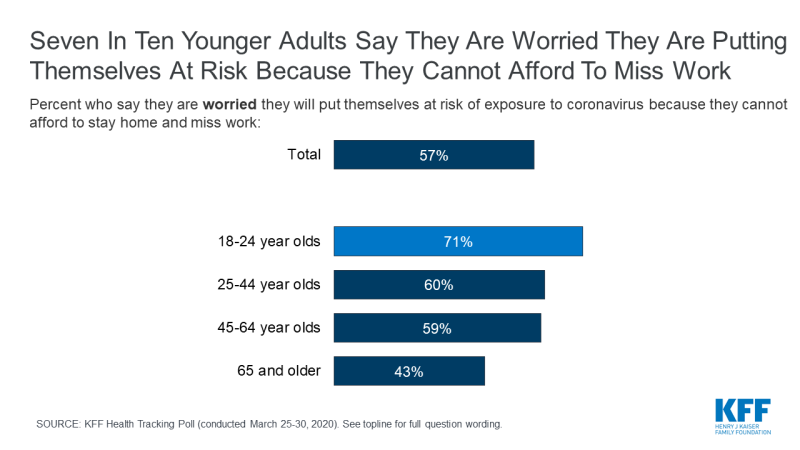 While four in ten 18-24 year olds are enrolled in either a 2-year or 4-year college according to the most recent data from the National Center for Education Statistics, most 18-24 year olds are also working either in a part-time or full-time capacity. At least one-third of both college-aged adults and their older counterparts (25-44 year olds) say they have lost their job, been laid off, or had their hours reduced without pay because of coronavirus (33% and 36%, respectively compared to 29% of 45-64 year olds and 13% of those 65 and older). In addition, seven in ten (71%) 18-24 year olds are worried they will put themselves at risk of exposure to coronavirus because they cannot afford to stay home and miss work (compared to 60% of 25-44 year olds, 59% of 45-64 year olds, and 43% of those 65 and older).