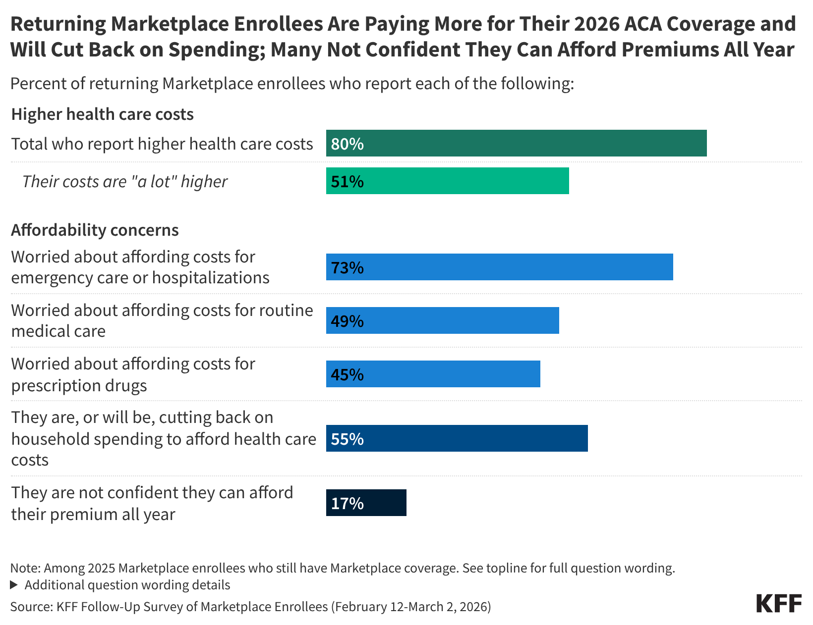 Following the expiration of the enhanced premium tax credits for people with Affordable Care Act (ACA) Marketplace plans, a new KFF follow-up survey of the same Marketplace enrollees KFF surveyed in 2025 finds half (51%) of returning enrollees say their health care costs are “a lot higher” this year compared to last year, including four in 10 who specifically say their premiums are “a lot higher.” In all, a large majority (80%) of these enrollees say their health care costs, which can include premiums, deductibles, co-pays, or coinsurance, are higher.