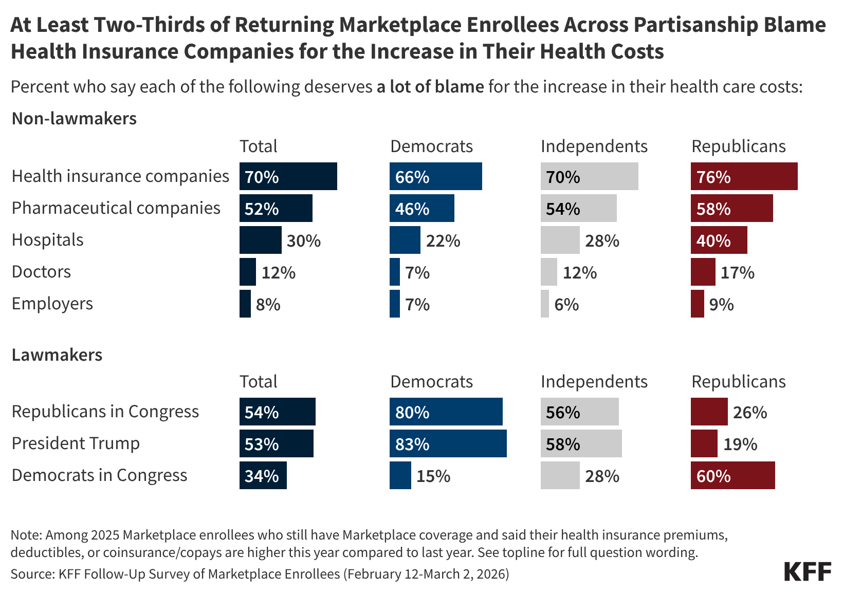 Among returning Marketplace enrollees who saw higher health costs, seven in 10 (70%) blame health insurance companies “a lot” for their increased costs and at least half place “a lot” of blame on congressional Republicans (54%), President Trump (53%), or pharmaceutical companies (52%). While majorities of partisans place “a lot” of blame on lawmakers from the opposite party, independents with Marketplace coverage are more likely to say Congressional Republicans (56%) and President Trump (58%) deserve “a lot” of blame than Congressional Democrats (28%).