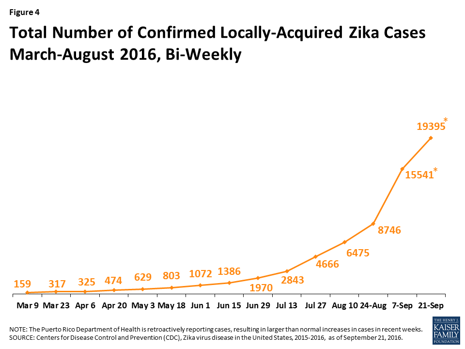 The first case of locally-acquired Zika virus in the United States was reported in Puerto Rico in December 2015,7 and the number of cases on the island have risen dramatically to 19,395 as of September 21, 2016,8 and are expected to continue to grow.9 Locally-acquired Zika is transmitted through the bite of infected mosquitos and the virus can cause microcephaly and other severe fetal brain defects among infected pregnant women. In addition, CDC is investigating the link between Zika and Guillain-Barré Syndrome, a rare disease that causes muscle weakness, and sometimes, paralysis. On August 12, 2016, the US Department of Health and Human Services declared the Zika outbreak in Puerto Rico to be a public health emergency. The declaration allows Puerto Rico to 1) apply for funds to hire and train individuals to assist in controlling the spread of Zika, including outreach and education programs through the U.S. Department of Labor’s National Dislocated Worker Grant, and 2) temporarily reassign staff of local public health department to help combat the spread of Zika.10 The virus poses a public health and financial challenge to the island—according to the CDC, the dollar amount of caring for a single child with birth defects is estimated to be in the millions.11