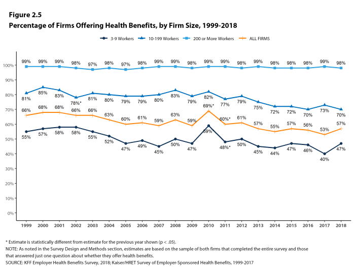 The Kaiser Family Foundation 2018 Employer Health Benefits Survey reports findings from a telephone survey of 2,160 randomly selected non-federal public and private employers with three or more workers. Researchers at NORC at the University of Chicago and the Kaiser Family Foundation designed and analyzed the survey. National Research, LLC conducted the fieldwork between January and July 2018. In 2018, the overall response rate is 32%, which includes firms that offer and do not offer health benefits. Among firms that offer health benefits, the survey’s response rate is also 32%. To improve estimates for small firms, the 2018 survey had a significantly larger sample than in previous years; the increased sample size led to both more firms completing the survey and a lower response rate than in years past. Unless otherwise noted, differences referred to in the text and figures use the 0.05 confidence level as the threshold for significance. Values below 3% are not shown on graphical figures to improve the readability of those graphs.