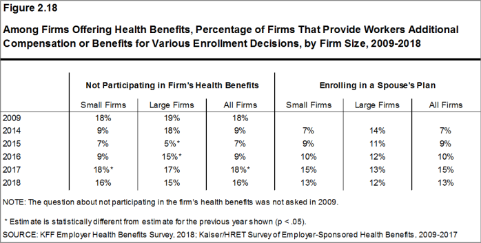 Inducements Not to Enroll. Among all firms that offer health benefits, 13% provide additional compensation or benefits to employees if they enroll in a spouse’s plan, and 16% provide additional compensation or benefits to employees if they do not participate in the firm’s health benefits.