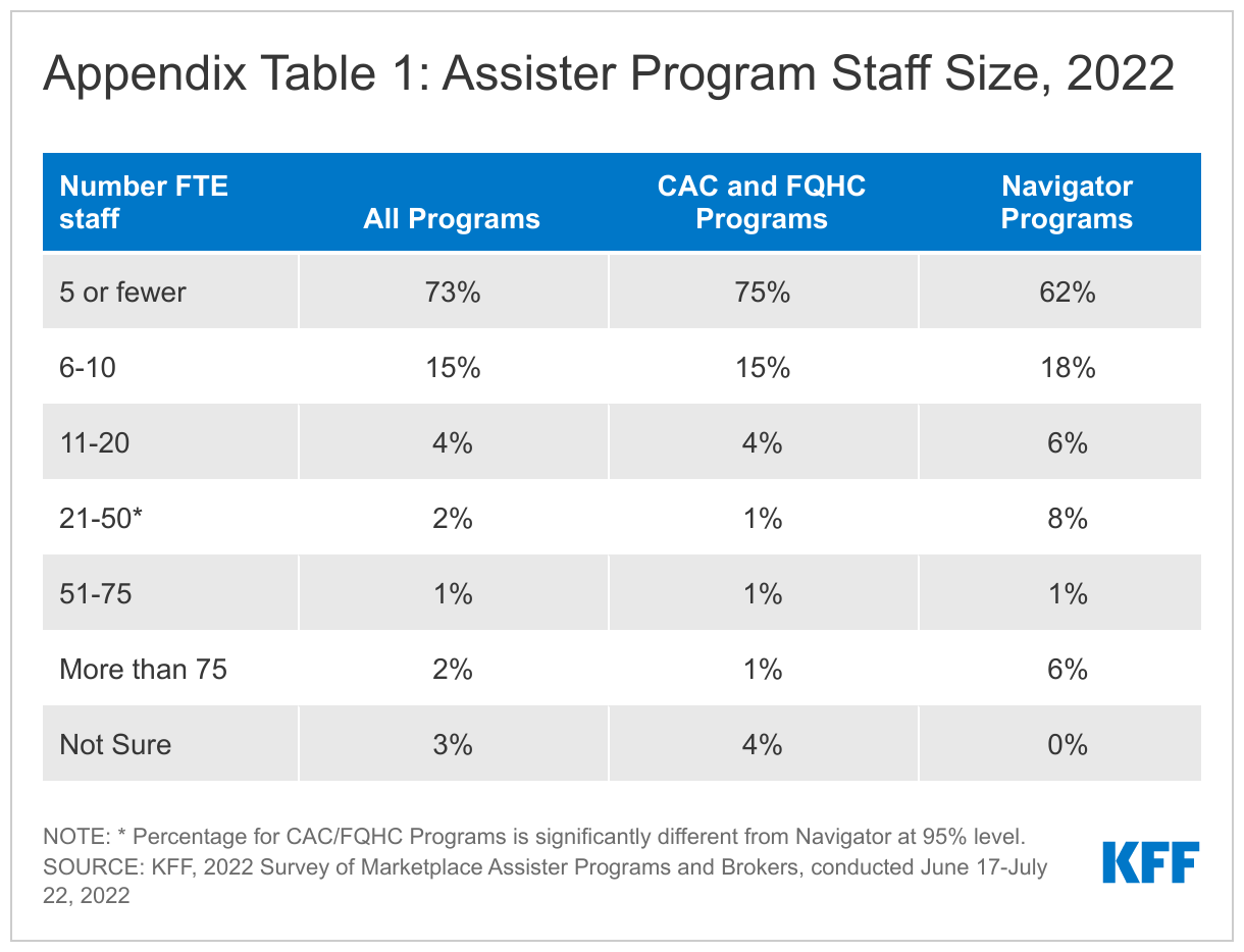 While the size of Assister Programs varies, most had a relatively small number of full-time equivalent staff during the 2022 Open Enrollment. Most Assister Programs (73%) indicated that they had five or fewer FTEs during the 2022 Open Enrollment, while 15% had between 6 and 10 FTEs. Navigator Programs had somewhat larger staff compared to the other Program types. (Appendix Table 1) Assister Programs report nearly all FTE staff were paid, not volunteer. Most Assister Programs (66%) indicated that the number of FTEs in 2022 was about same as in prior year; 13% say FTE staff grew from 2021 while 21% of Programs said staff size is smaller than in the year before.