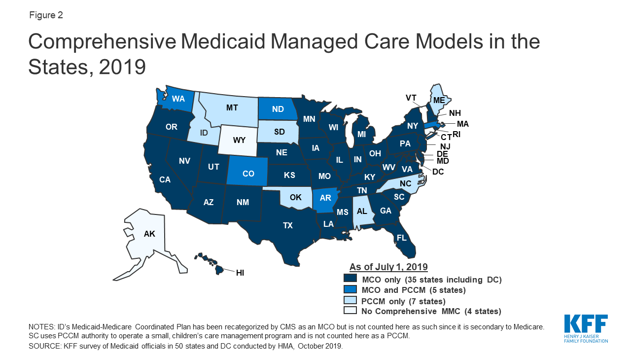 As of July 1, 2019, among the 40 states with comprehensive risk-based managed care organizations (MCOs), 33 states reported that 75% or more of their Medicaid beneficiaries were enrolled in MCOs. States continue to carve-in behavioral health services to MCO contracts and nearly all states have in place managed care quality initiatives like pay for performance or capitation withholds. Medicaid programs have been expanding their use of other service delivery and payment reform models to achieve better outcomes and lower costs. Forty-four states had one or more delivery system or payment reform initiatives in place in FY 2019 (most often patient centered medical homes or ACA Health Homes) with 14 states adding or expanding such reforms in FY 2020.