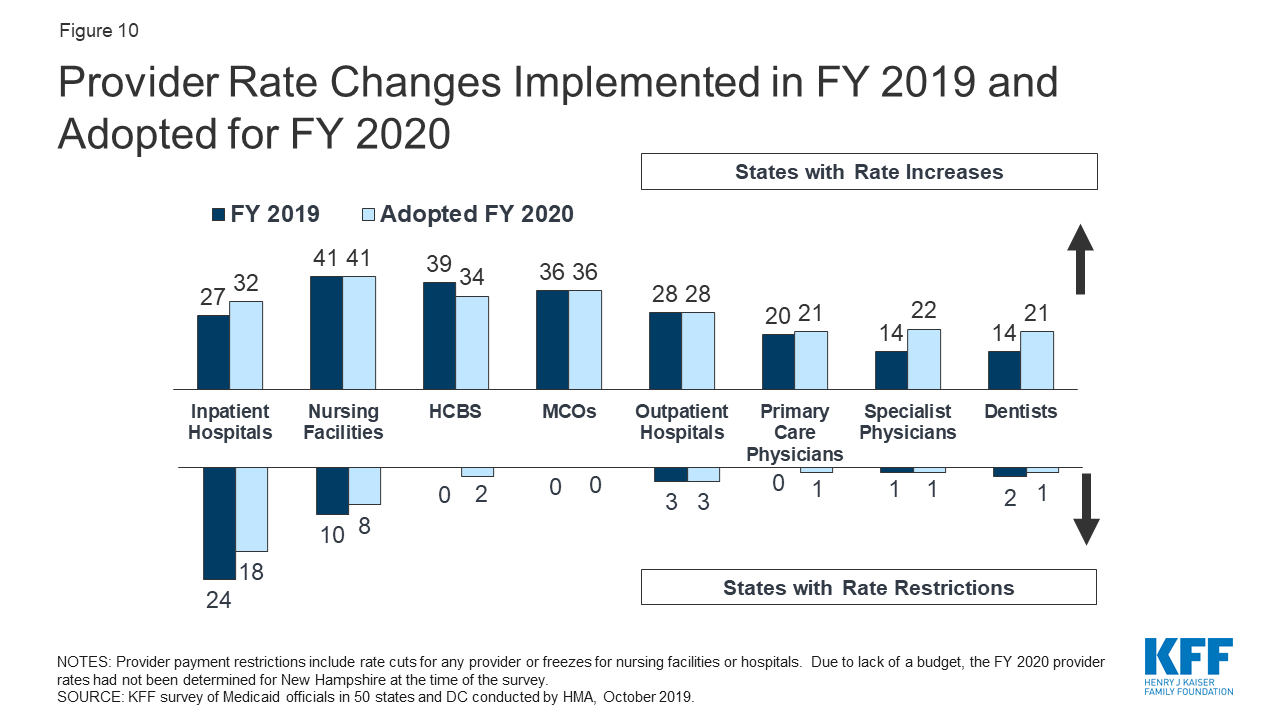 This report provides an in-depth examination of the changes taking place in Medicaid programs across the country. The findings are drawn from the 19th annual budget survey of Medicaid officials in all 50 states and the District of Columbia conducted by the Kaiser Family Foundation (KFF) and Health Management Associates (HMA), in collaboration with the National Association of Medicaid Directors (NAMD). This report highlights certain policies in place in state Medicaid programs in FY 2019 and policy changes implemented or planned for FY 2020. The District of Columbia is counted as a state for the purposes of this report. Given differences in the financing structure of their programs, the U.S. territories were not included in this analysis. Key findings from the report are pulled from five sections: eligibility, delivery systems, benefits, long-term services and supports, and provider rates and taxes. Each section highlights key issues to watch for future policy development (ES Figure 1).