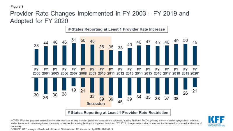 148. Historically, Medicaid reimbursement for hospitals and nursing homes was cost-based, automatically reflecting incurred cost increases. When rates for these providers are frozen, such annual increases do not occur; hence for this report, rate freezes are counted as restrictions. ↩︎
