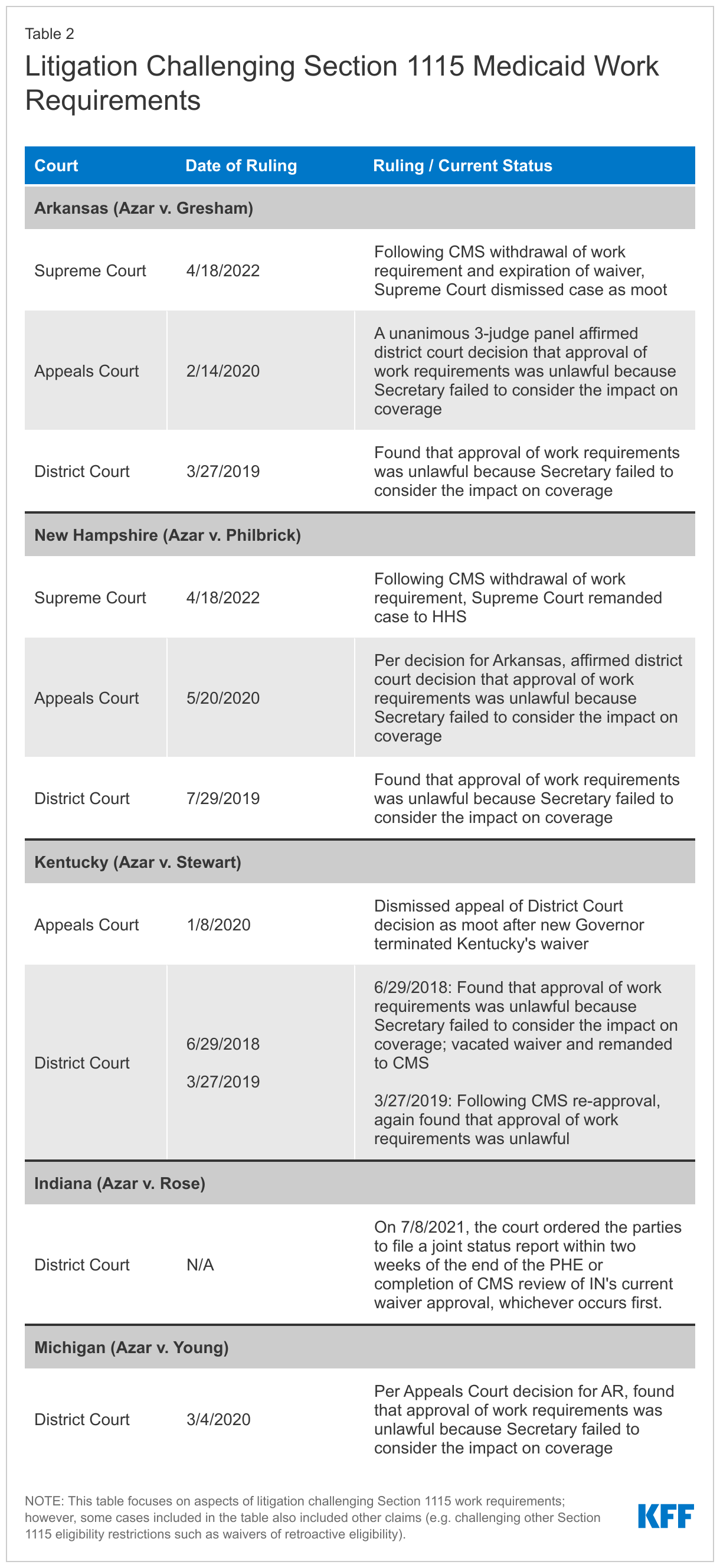 Following the Biden Administration’s withdrawals, in April 2022 the Supreme Court dismissed pending appeals in cases that had found work requirement approvals unlawful. Previously, in February 2020 a DC Circuit Court of Appeals panel affirmed in a unanimous opinion that the HHS Secretary’s approval of Medicaid work requirements in Arkansas was unlawful because the Secretary failed to consider the impact on coverage. The DC appeals court subsequently affirmed that the Secretary’s New Hampshire approval also was unlawful. Before leaving office, the Trump Administration asked the Supreme Court to reverse these appeals court decisions and the Court agreed to hear the cases in December 2020. However, following the Biden Administration’s withdrawals of the Arkansas and New Hampshire work requirements, in April 2021 the Supreme Court removed the cases from its oral argument calendar. In April 2022, the Biden Administration asked the Court to vacate the lower court decisions and dismiss the Arkansas case as moot (as that waiver had expired) and remand send the New Hampshire case back to HHS (as New Hampshire had not asked the Court to review the case involving its waiver). In April 2022, the Court granted this motion, effectively putting an end to the pending litigation. (For more information on work requirement litigation across states, see Appendix Table 2 and Figure 1.)