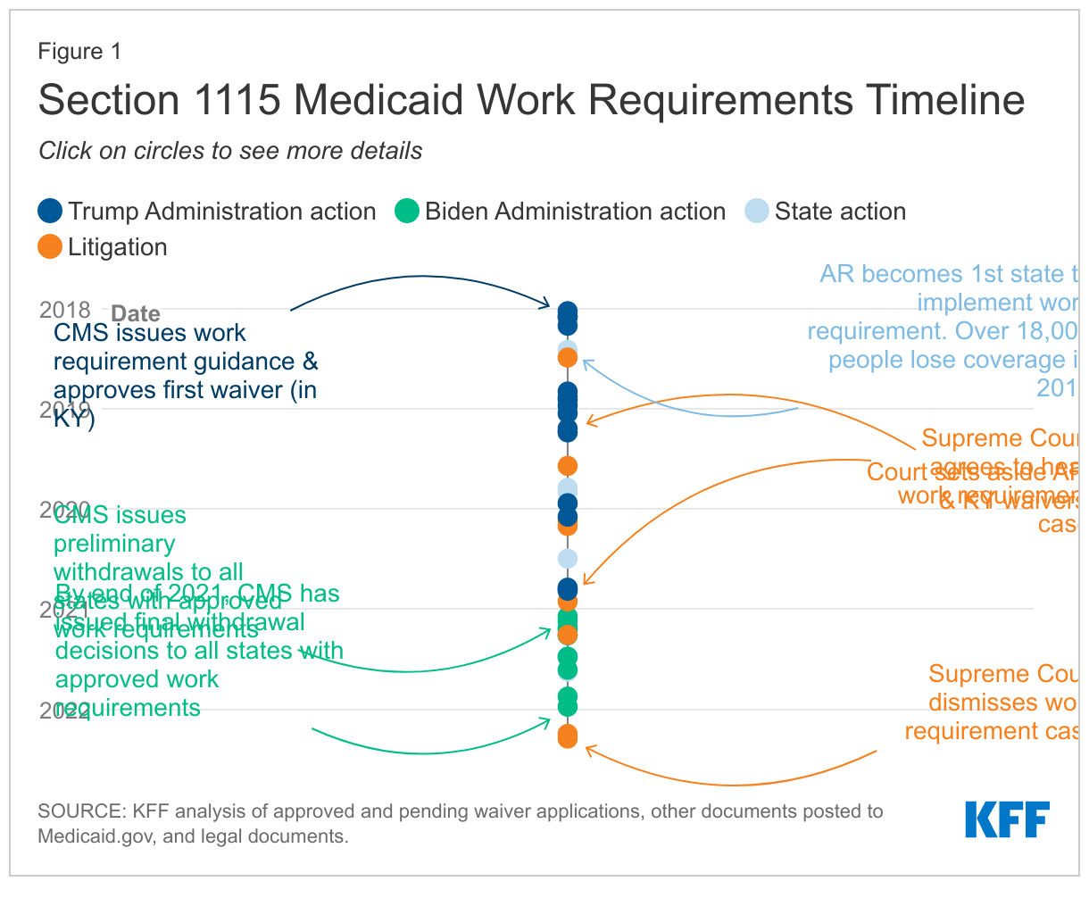 As a health coverage program, Medicaid can support employment by providing health coverage and access to care and medications that enable people to work, and it can also provide voluntary employment referral and/or work support programs. In a departure from previous administrations, the Trump Administration encouraged and approved Section 1115 waivers that conditioned Medicaid coverage on meeting work and reporting requirements. Though few of these work requirements were implemented due to legal challenges, state withdrawals, and/or the COVID-19 pandemic, available data suggests that such requirements can result in substantial coverage loss, including among eligible individuals, as evidenced by the more than 18,000 individuals who lost coverage in seven months under Arkansas’ work and reporting requirement. Based in part on this data, the Biden Administration withdrew all approved work requirement waivers by the end of 2021; Georgia has since challenged the withdrawal of its work requirements in court. Following these withdrawals and the expiration of Arkansas’ waiver, the Supreme Court dismissed pending appeals in cases that had found work requirement approvals unlawful. Though the Court’s action does not preclude future presidential administrations from approving new Section 1115 work requirements, these would likely face legal challenges.