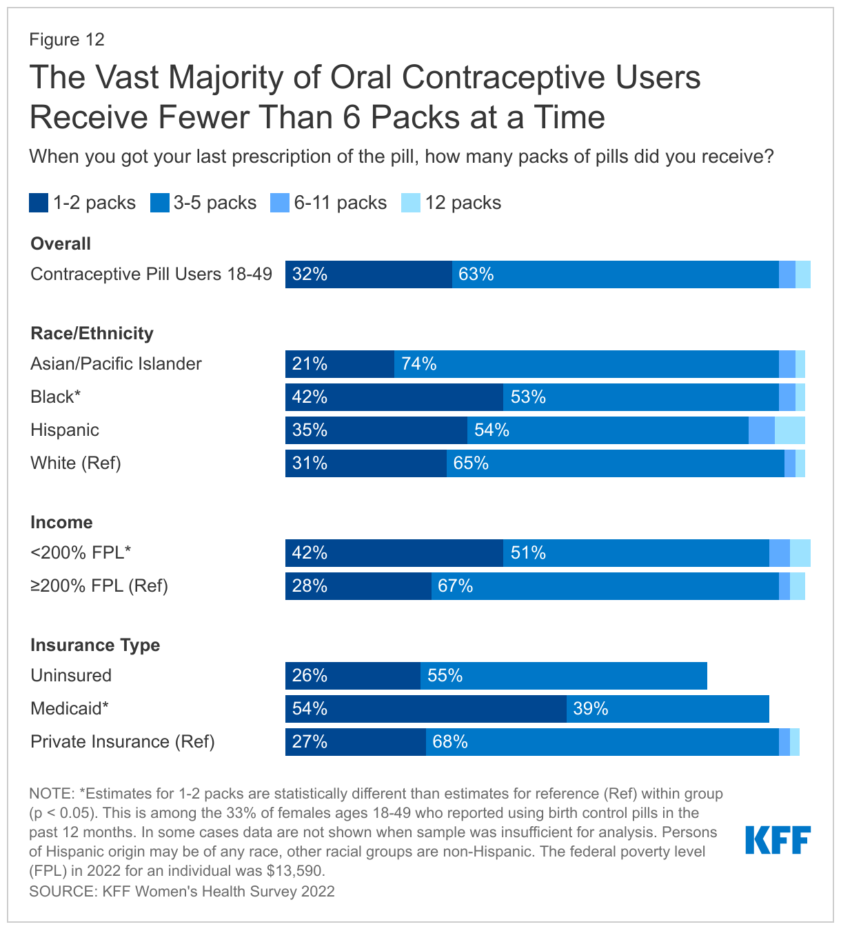 There has been a growing interest in making an extended supply of contraceptive pills and other hormonal methods available to those who use them. However, many females are still only getting one to two months' supply at time. Overall, about one third of females who used oral contraceptives got a one- or two-month supply. This share was higher among Black females, as well as those with low incomes, and those with Medicaid coverage (Figure 12).