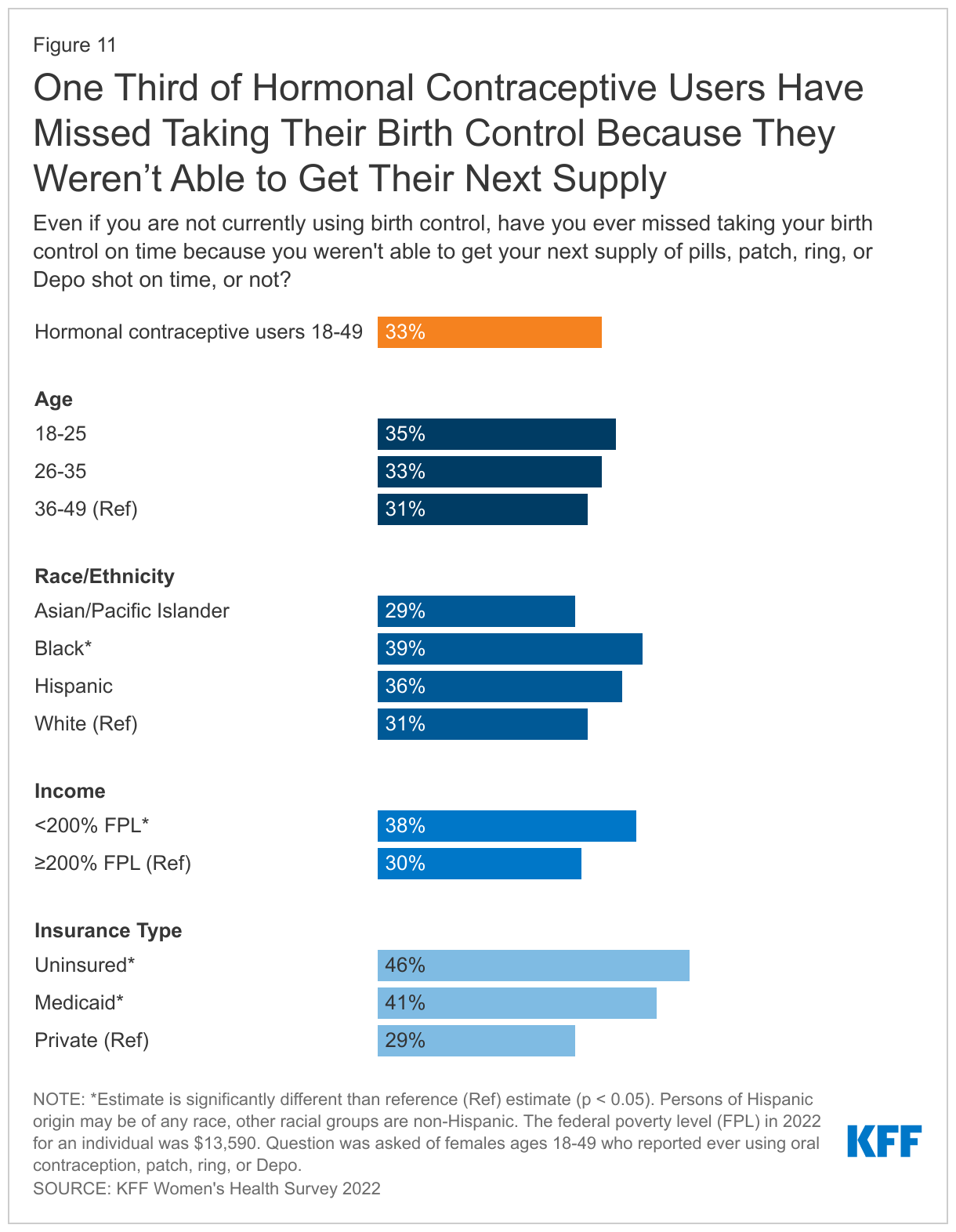 One-third (33%) of hormonal contraceptive users say they have missed taking their birth control because they were not able to get their next supply on time. This share is higher among Black females (39%) compared to White females (31%) and those with low incomes (38%) compared to those with higher incomes (30%). This was a problem for nearly half (46%) of uninsured females and four in ten (41%) females with Medicaid (Figure 11). Studies have documented the importance of ensuring people have adequate contraceptive supply in adherence to their contraceptive method.