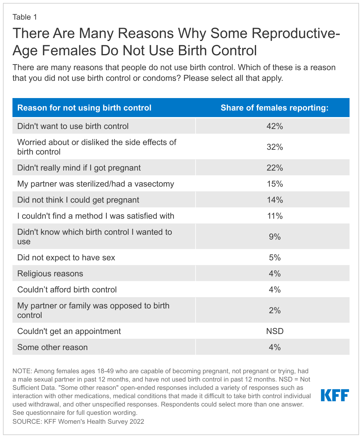 Contraceptive care is an important component of overall health care for many people. Federal and state policies shape access to and the availability of contraceptive care, but factors such as provider characteristics, as well as individual preferences and experiences also impact contraceptive choices and use. This report provides a close examination of reproductive age (18-49) females’ (including those who identify as women and other genders) experiences with contraception, insurance coverage, contraceptive preferences, and interactions with the health care system based on an analysis of the 2022 KFF Women’s Health Survey, a nationally representative survey of females ages 18 to 64 in the U.S.