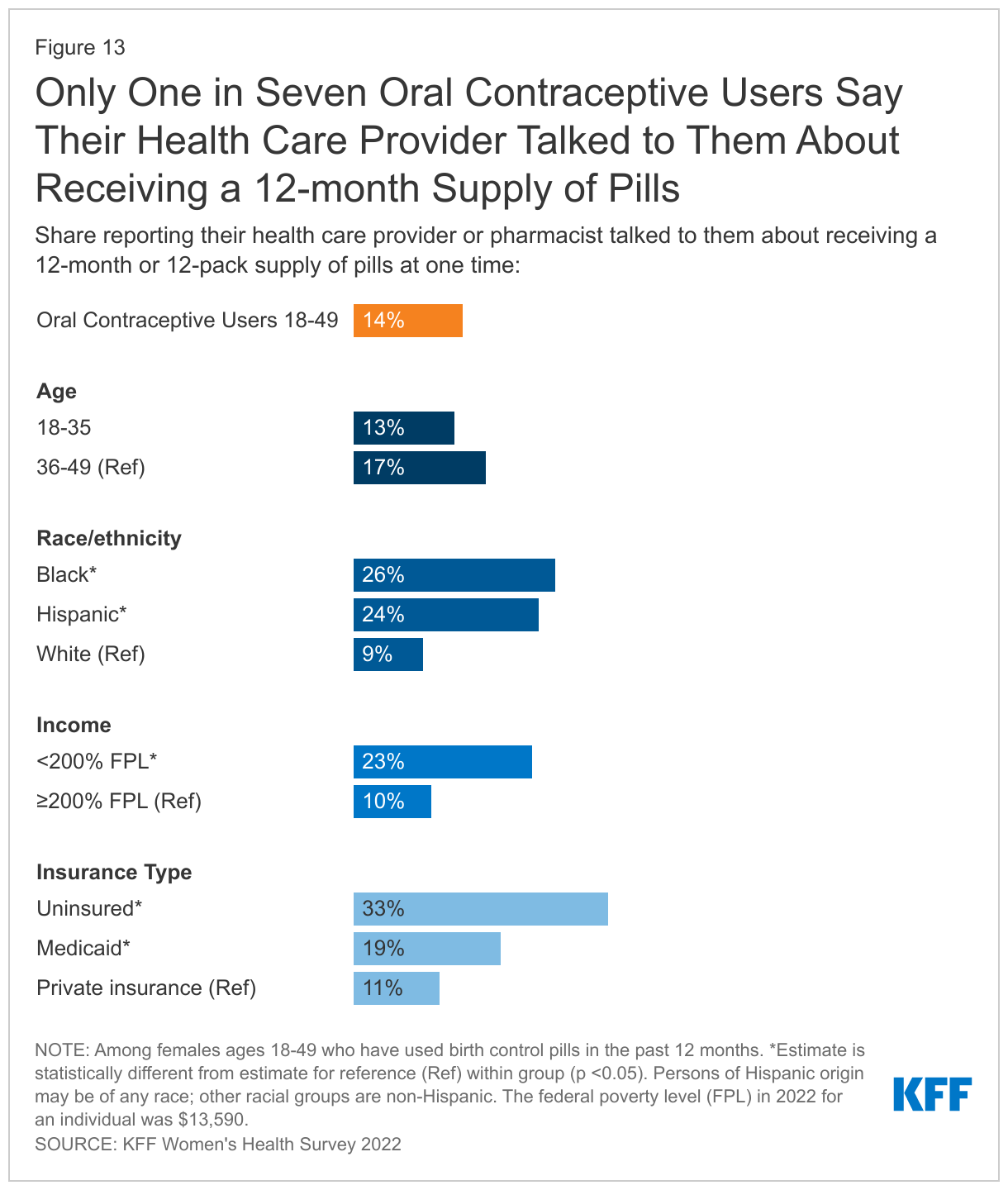 Research has shown that best practice is to offer oral contraceptive users an extended supply, and some states now require their state-regulated plans to cover a 12-month supply of contraceptives. However, few females get a 12-month supply. Furthermore, only 14% of females who have used birth control pills in the past 12 months say their health care provider or pharmacist talked to them about receiving a 12-months or 12-pack supply of pills at one time. Larger shares of Hispanic (24%), Black (26%), uninsured (33%), females with Medicaid (19%), and females with low incomes (23%) say their health care provider or pharmacist talked to them about receiving a 12-month or 12-pack supply of pills at one time than their counterparts (Figure 13).