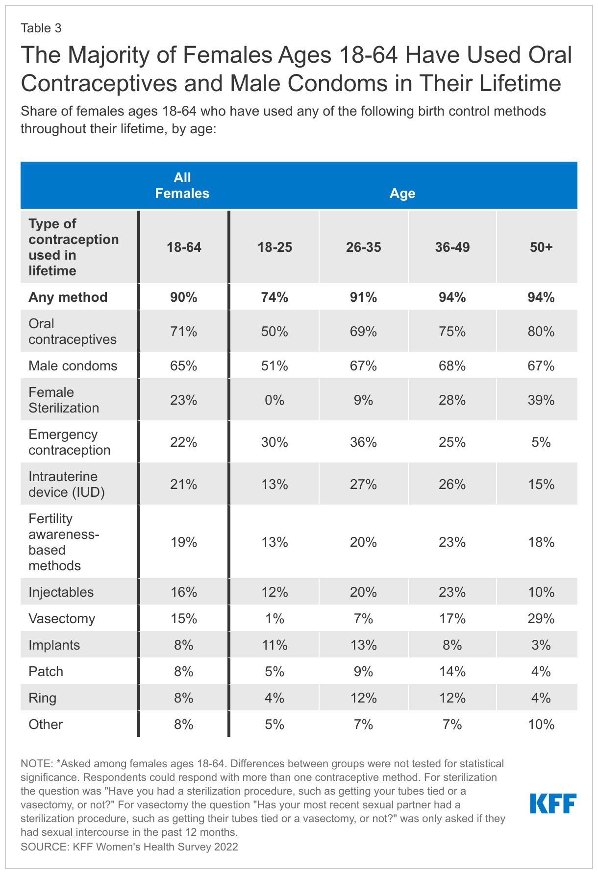 Nine in ten females (90%) report using contraception at some point in their lifetime and most (76%) use more than one type of contraception across their lifespan.Contraceptive preferences often change throughout one’s reproductive years. On average, females use 2.7 different contraceptive methods throughout their lifetime. Seven in ten females (71%) ages 18-64 say they have used oral contraceptives, including a larger share of females ages 36-64 (Table 3). Male condoms are the second most frequently used contraceptive among females ages 18-64 (65%). Among younger females ages 18-35, higher shares have used implants and emergency contraception compared to females overall. Switching to different contraceptive methods is common, reinforcing the importance of access to the full range of contraceptive methods without financial barriers. Also, because contraceptive needs can change over one’s reproductive lifespan; what works in one’s twenties may not be what is best for them in their thirties or forties.