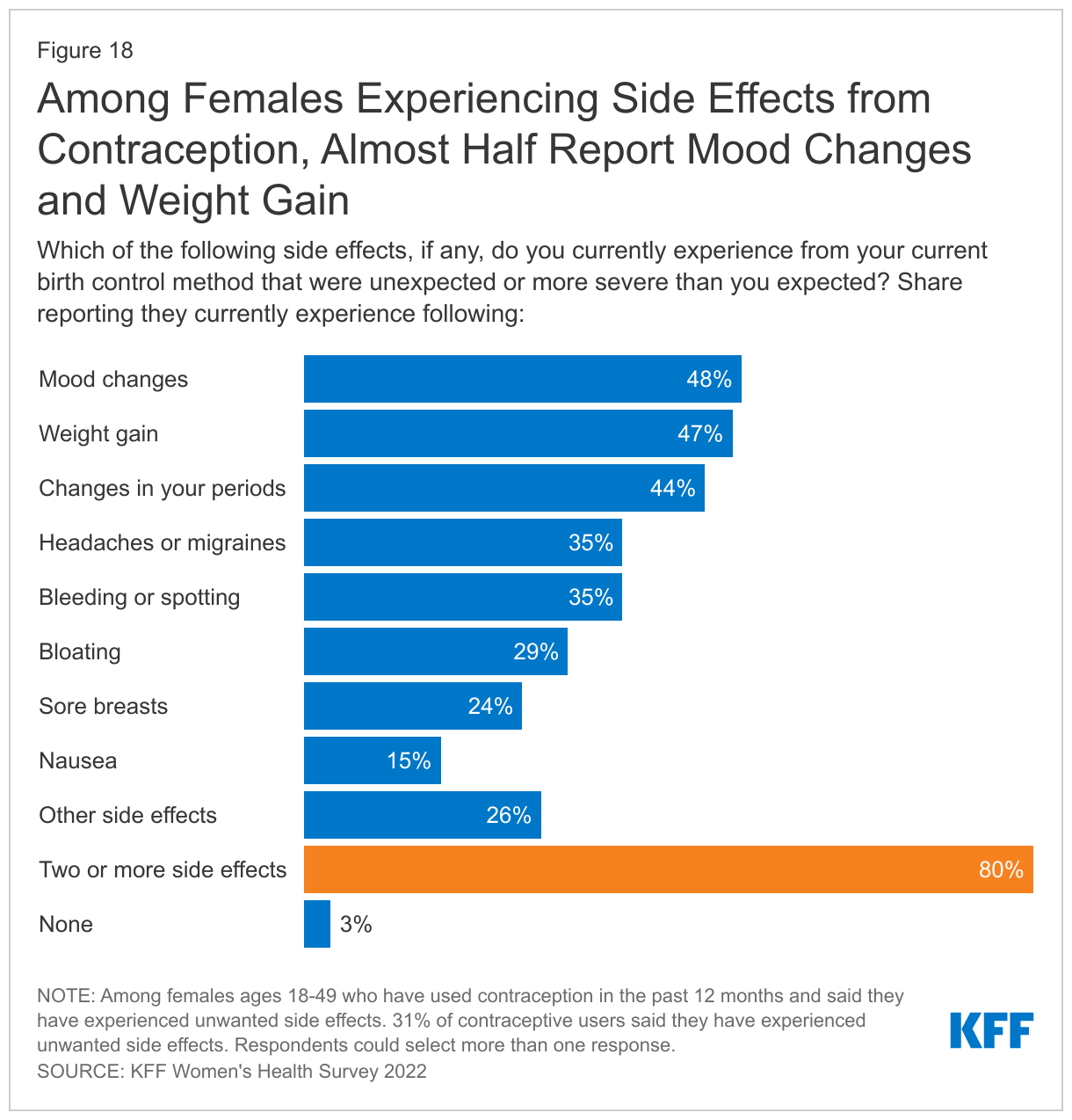 Almost one-third of contraceptive users (31%) say they are experiencing side effects from their current method, and just over half (52%) say the side effects are more severe than they expected. Among those experiencing side effects, more than four in ten report mood changes (48%), weight gain (47%), and changes in periods (44%) (Figure 18). Eight in ten (80%) say they experienced more than one of these side effects. Just over half (54%) say they have talked to their health care provider about these side effects.